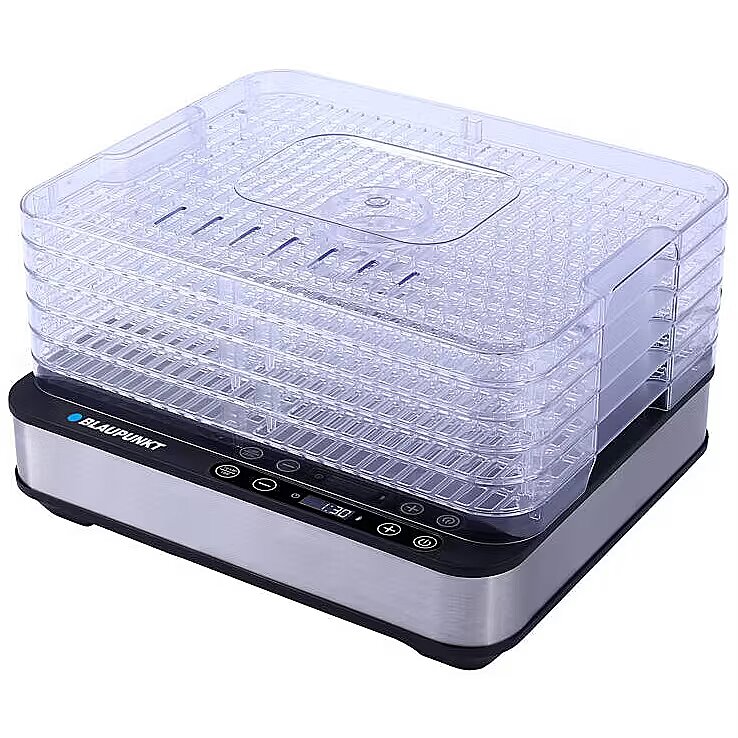 Suszarka do żywności FDD601 marki Blaupunkt składa się z pięciu przeźroczystych sit, a ich łączna powierzchnia suszenia to 3250 cm2. Sita posiadają 3 cm wysokości i są wielkości 32×25 cm, co sprawia, że jednorazowo możemy wysuszyć sporą ilość zebranych darów lasu lub ulubionych owoców. Szybkość suszenia gwarantuje także moc o wysokości 420 W. Pozwala ona osiągnąć wysoką temperaturę konieczną do suszenia większych lub bardziej mokrych kawałków owoców, takich jak plasterki jabłek. Wymuszony przepływ powietrza poprawia cyrkulację i pozwala suszyć produkty bardziej równomiernie.