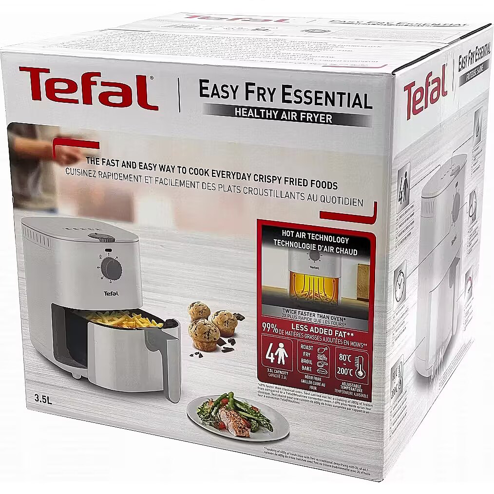 LongSummaryDescription - Tefal Easy Fry Essential EY130A. Product type: Hot air fryer, Capacity: 3.5 L, Fryer food capacity: 0.6 kg. Construction type: Single, Product colour: White, Control type: Rotary. Power: 1030 W. Width: 247 mm, Depth: 353 mm, Height: 296 mm. Package width: 324 mm, Package depth: 344 mm, Package height: 326 mm