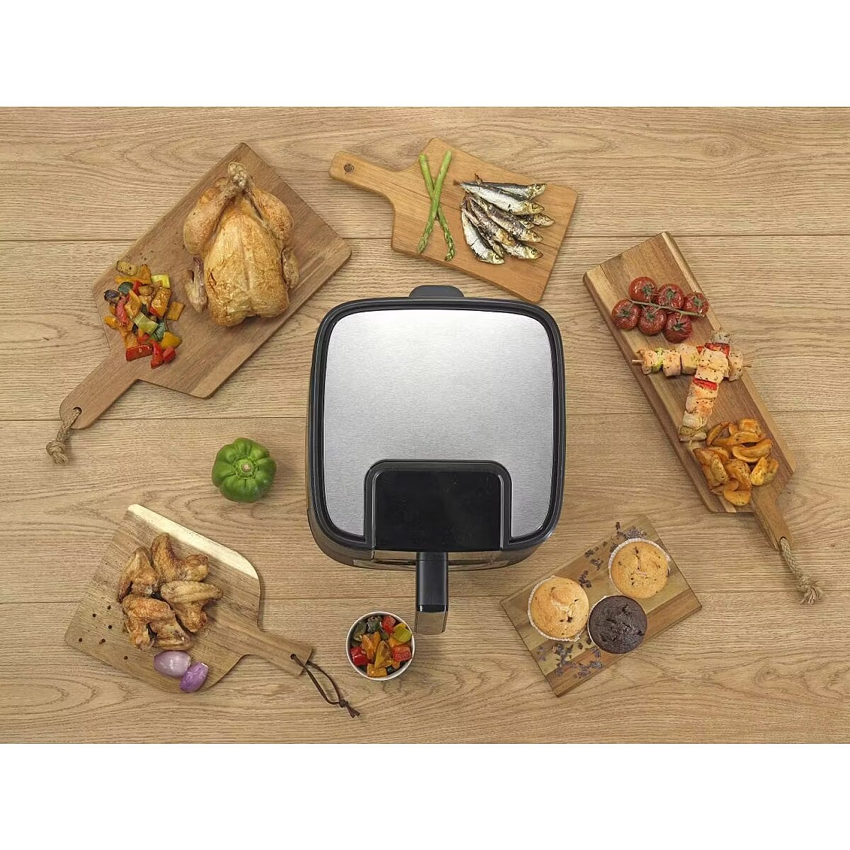 LongDesc - Cooked with one touchFor fast and energy efficient cooking, there are 8 pre-set programmes to choose from. In this case, the temperature and time will be set automatically. You just need to place the food in the air fryer and enjoy in a crispy crust and moist in the middle.Adjust the temperature and timeTo achieve the perfect crispiness of your food you can set the temperature manually between 80 and 200°C. The timer can be set for up to 60 minutes. A pleasant sound will let you know when your food is ready.Only the smell of delicious foodCavity is made of premium inox which prevents an unpleasing smell of plastic. It is safe and durable. The light heater and fan are protected with inox mesh and create a perfect heat distribution.Complete control over cooking processWith a transperent window you can track if your food is being overcooked or not. You don't even need to open the air fryer to control the process, which means no hot air losses and no disruption of cooking cycle.Fry it allThe capacity of frying basket is 5.4 L. That means some real help is coming to your family kitchen. The frying basket has non-stick coating, so even the cleaning is easy.