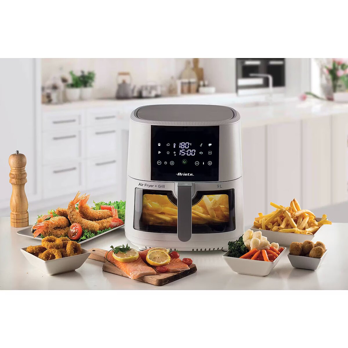 ShortSummaryDescription - Ariete 4630 Air fryer 9L, 1300W, Capacity 9L, Cooking capacity 2.5kg, 8 preset programs, Temperature of up to 200°, Transparent basket for cooking control, White, Hot air fryer, 9 L, 3.5 kg, 200 °C, Single, White