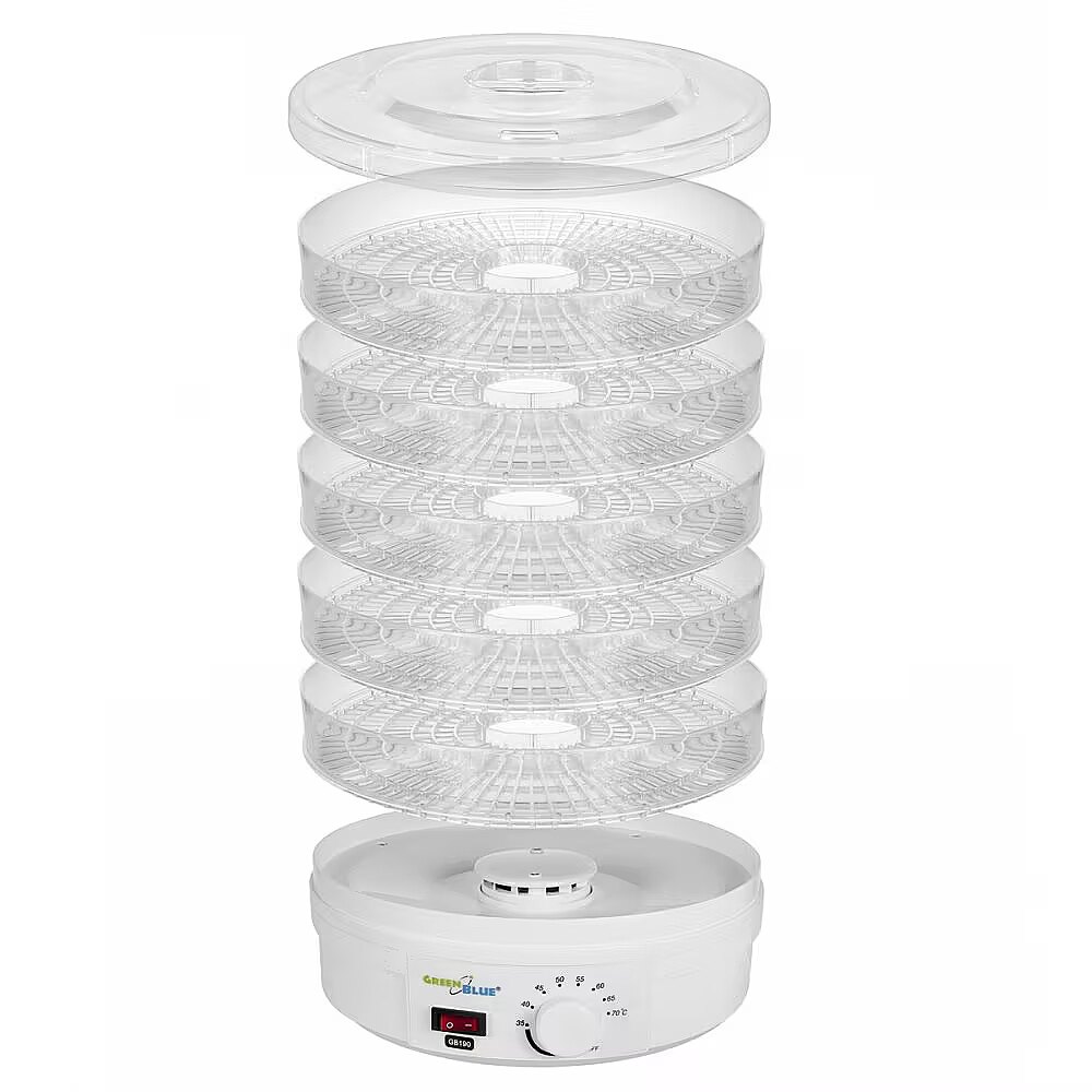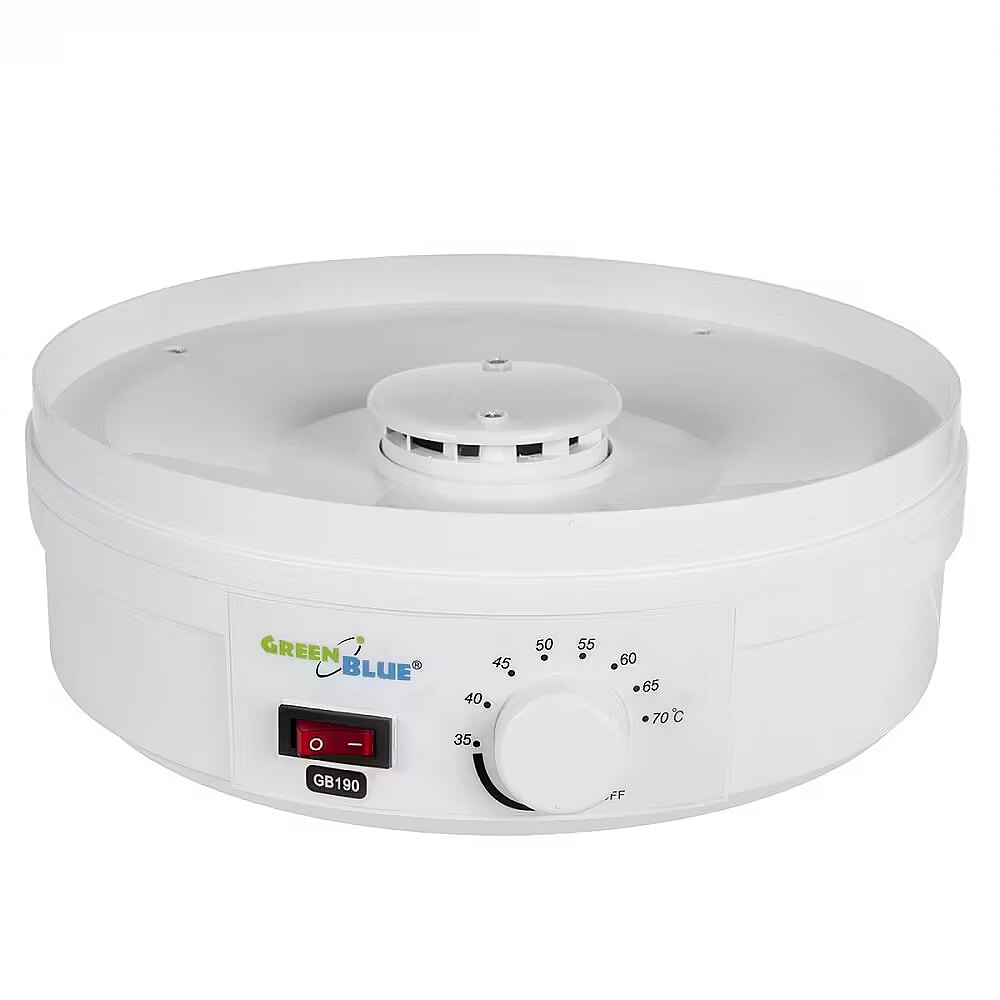 Description - Mushroom, vegetable and fruit Food Dehydrator GreenBlue GB190 Power 250W - very quiet, high sieve 4.5 cm With the help of the GreenBlue GB190 food dehydrator you can prepare for the winter a large supply of dried vegetables, fruits and mushrooms that are perfect for preparing tasty soups or healthy compotes made of apples, plums or pears. In turn, you can prepare beautiful decorations not only for Christmas with dried oranges and mandarins. In addition, you can feel the taste of home made herbal tea with picked and dried mint, lime or lilac ..