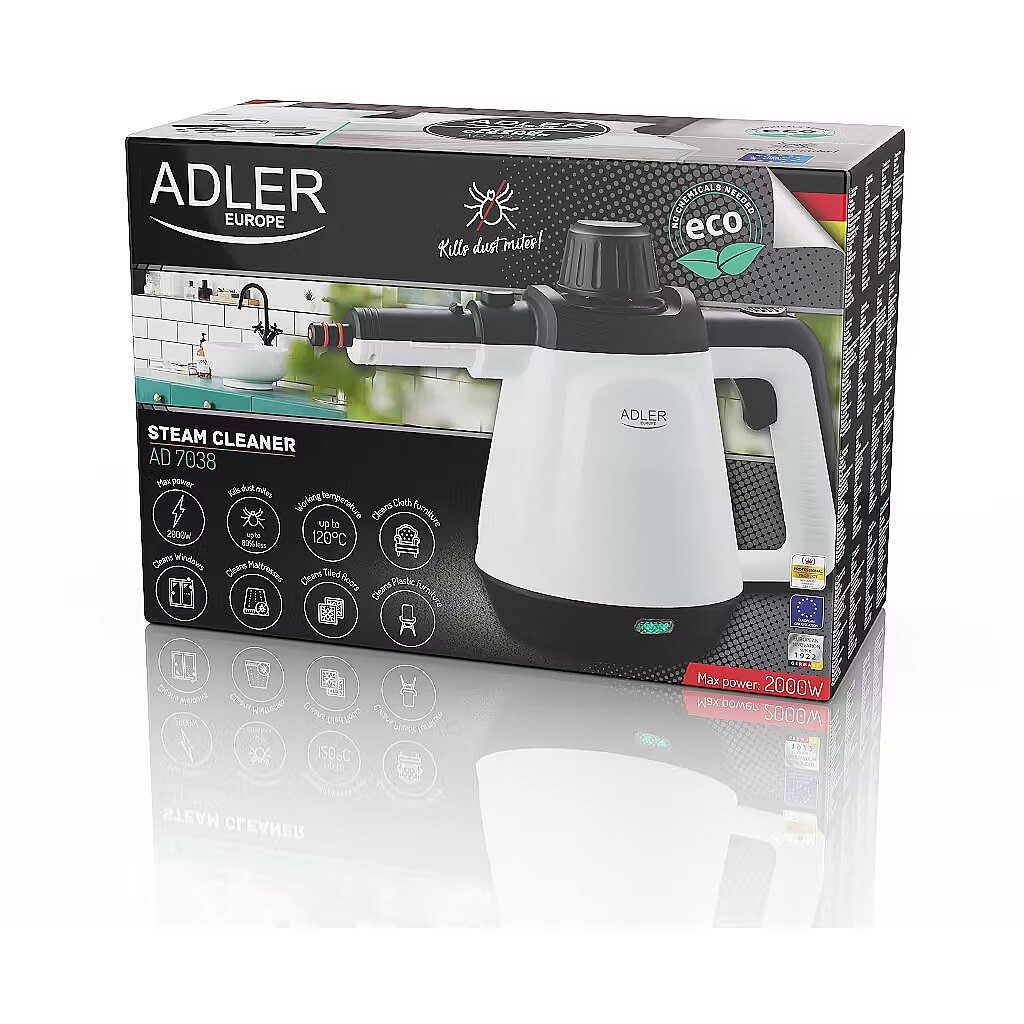 Description - Czyścik parowy z zestawem końcówek AD 7038 Czyścik parowy z zestawem funkcjonalnych końcówek to skuteczne rozwiązanie problemów zarówno codziennego, jak i okazjonalnego sprzątania. Emitowana pod dużym ciśnieniem para dociera w trudno dostępne miejsca. Z kolei wysoka temperatura sprawia, że usuwanie nawet zaschniętego brudu i tłuszczu staje się wyjątkowo proste. Używanie myjki parowej zabija też bakterie, pozostawiając czystą, higieniczną powierzchnię. Odkryj moc głębokiego czyszczenia bez użycia chemikaliów z Adler AD 7038 - zaawansowanym czyścikiem parowym, który odmieni Twoje podejście do sprzątania. Wyposażony w potężny zestaw 13 końcówek, ten innowacyjny sprzęt jest stworzony do radzenia sobie z różnorodnymi zadaniami czyszczenia w domu, biurze, a nawet w samochodzie. Wysoka efektywność: doskonały do czyszczenia płytek podłogowych i ściennych, okien, mebli tekstylnych, plastikowych, materaców oraz więcej. Z Adler AD 7038 usuniesz do 80% więcej roztoczy z materaców, zapewniając zdrowsze środowisko dla Ciebie i Twoich bliskich. Mocna produkcja pary: generuje parę do 44 g/min z temperaturą do 120°C, zapewniając głębokie czyszczenie i dezynfekcję bez użycia chemikaliów. Maksymalne ciśnienie pracy 3.5 Bara pozwala na skuteczne usuwanie brudu i plam. Bezpieczeństwo: wyposażony w system ochrony przed przegrzaniem, Adler AD 7038 gwarantuje bezpieczne użytkowanie nawet podczas długotrwałych sesji czyszczenia. Wszechstronny zestaw końcówek: w komplecie znajduje się 13 specjalnie zaprojektowanych akcesoriów, w tym szczotka metalowa, szczotka nylonowa, elastyczny wąż przedłużający, trzy 33 cm rury przedłużające, duża dysza, płaska szczotka, szczotka podłogowa, łącznik do szczotki podłogowej, mała szmatka, oraz szmatka do szczotki podłogowej - wszystko, czego potrzebujesz do kompleksowego czyszczenia w zasięgu ręki.