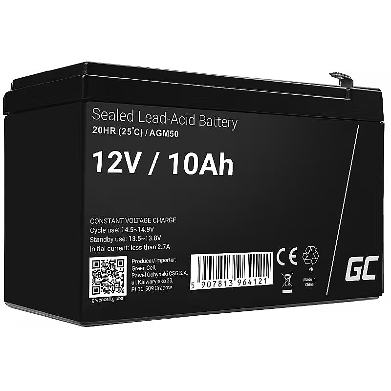 Description - AGM VRLA 12V 10Ah battery What is an AGM battery? The AGM is an energy storage battery with a wide range of commercial applications. Not only can we power toys and alarm systems with it, but it is also the heart of any UPS. Cyclical and buffer operation Green Cell AGM batteries have a very wide range of applications. They can be used for both cyclical and buffer operation. Cyclical operation In cyclic operation, the battery is used as a stand-alone energy source. AGMs of this type are designed for very frequent charging and discharging. They are used in this way in alarm systems, UPS units, cash registers or emergency lighting. Buffer operation Buffer operation allows the battery to act as a back-up power supply for the connected device. The battery connected to the power supply system provides additional power in the event of a failure of the main power source. This is how they are used in wheelchairs, photovoltaic installations, golf carts, toys and lawnmowers. Maintenance-free operation Batteries made with AGM technology are designed to ensure the greatest possible safety during use. Thanks to the self-regulation function (VRLA valves), AGMs provide up to 5+ years of maintenance-free operation. This increases operational safety, regardless of the position of the battery. Safety AGM batteries are designed for even the most extreme conditions. The fibreglass used means that the electrolyte is sealed in the housing which allows the battery to be used in any position without fear of the contents spilling out. This is particularly important in the case of powered toys that are exposed to various types of shock. This makes Green Cell AGM batteries completely safe for users.