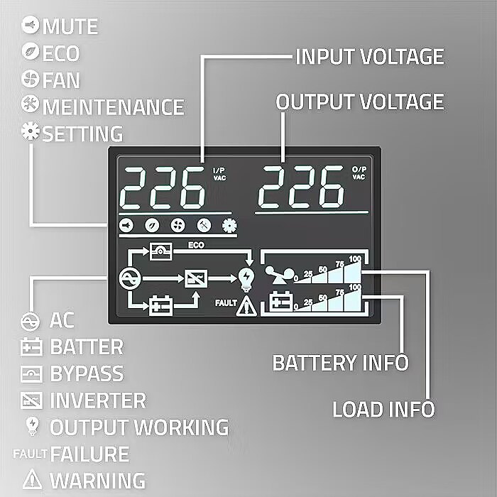 An online UPS has a voltage that is continuously recycled; in the event of an unexpected drop in mains voltage, the UPS maintains the operation of the connected device, thanks to the built-in batteries, which are continuously charged. Thus, mains power is only needed to charge the batteries. Permanently connected devices always receive clean energy, without interference from the battery, so the output voltage of the online UPS will always be constant, regardless of the input voltage. The back-up time of the equipment is from a few minutes to several minutes which allows data to be saved and the equipment to be switched off safely, minimising the risk of data loss and equipment damage.