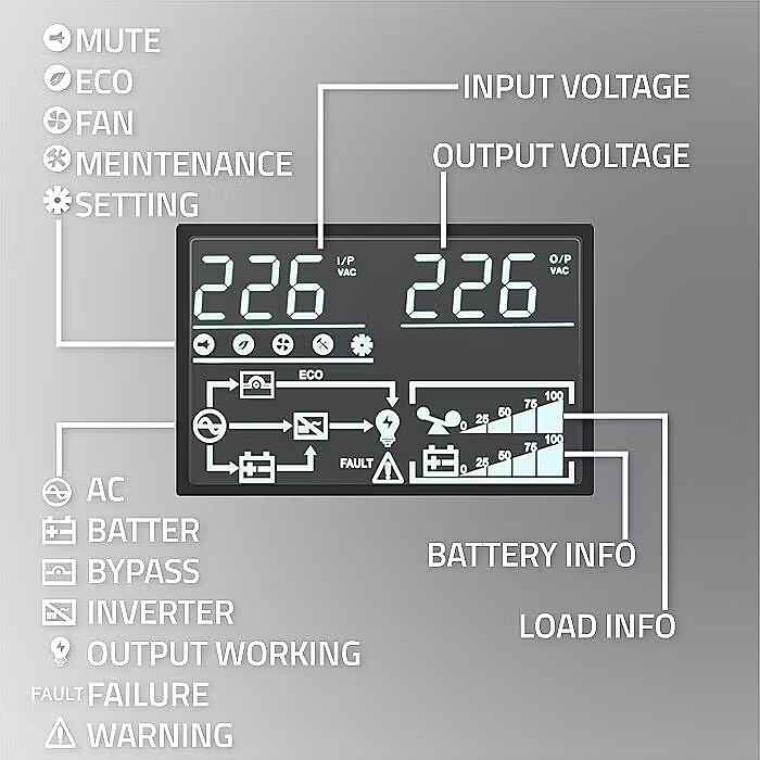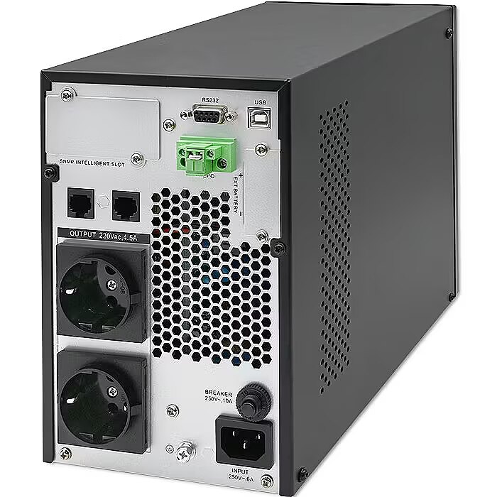 An online UPS has a voltage that is continuously recycled; in the event of an unexpected drop in mains voltage, the UPS maintains the operation of the connected device, thanks to the built-in batteries, which are continuously charged. Thus, mains power is only needed to charge the batteries. Permanently connected devices always receive clean energy, without interference from the battery, so the output voltage of the online UPS will always be constant, regardless of the input voltage. The back-up time of the equipment is from a few minutes to several minutes which allows data to be saved and the equipment to be switched off safely, minimising the risk of data loss and equipment damage.