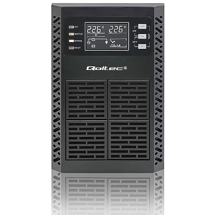 Qoltec UPS units offer stable interference-free pure sine wave power. It's complete protection for your devices, thanks to the double conversion, which first converts the AC of the mains supply to DC and then to AC, ensuring the highest level of power quality and protecting against potential mains disturbances such as voltage drops, power outages, surges and failures.