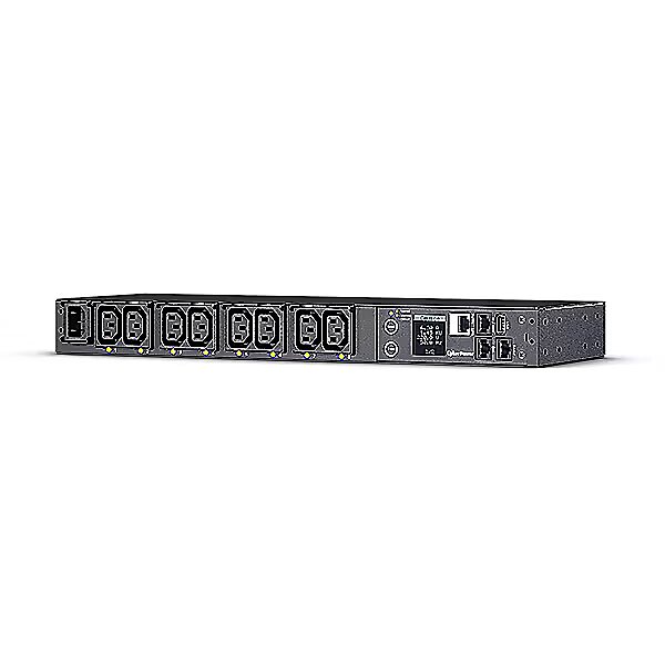 LongDesc - CyberPower PDU41004 Switched series power distribution unit provides output from a UPS unit, generator, or utility power to multiple connected devices in datacenter environments. The unit supports remote individual outlet control over the network, allowing administrators to turn on/off connected devices from any location. Administrators can further determine the power sequence used to turn individual outlets on or off. The power management web interface offers real-time remote monitoring of the PDU vitals of the outlets of networked clients. Event logging via a web browser or network connection allows users to review a history of power conditions. When specified power events occur, automatic event notifications will be sent via email, SMS text, or SNMP trap to designated users so that they can take immediate actions. The featured RJ45 port enables the connection of the optional environmental sensor (ENVIROSENSOR), which can provide real-time temperature and humidity monitoring in an IT center. The product is also certified to be interoperable and compatible with Cisco Compatible™ network environments, which helps to achieve the best energy performance possible in the datacenter scenario.