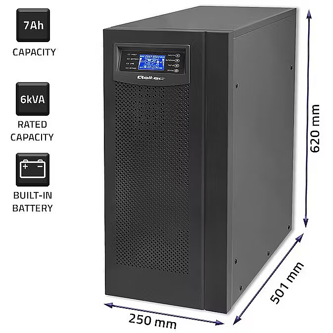 Qoltec's online UPS provide stable interference-free pure sine wave power. It's complete protection for your devices, thanks to the double conversion that first converts the AC of the mains supply to DC and then to AC, ensuring the highest level of power quality and protecting against potential mains disturbances such as voltage drops, power outages, surges and failures.