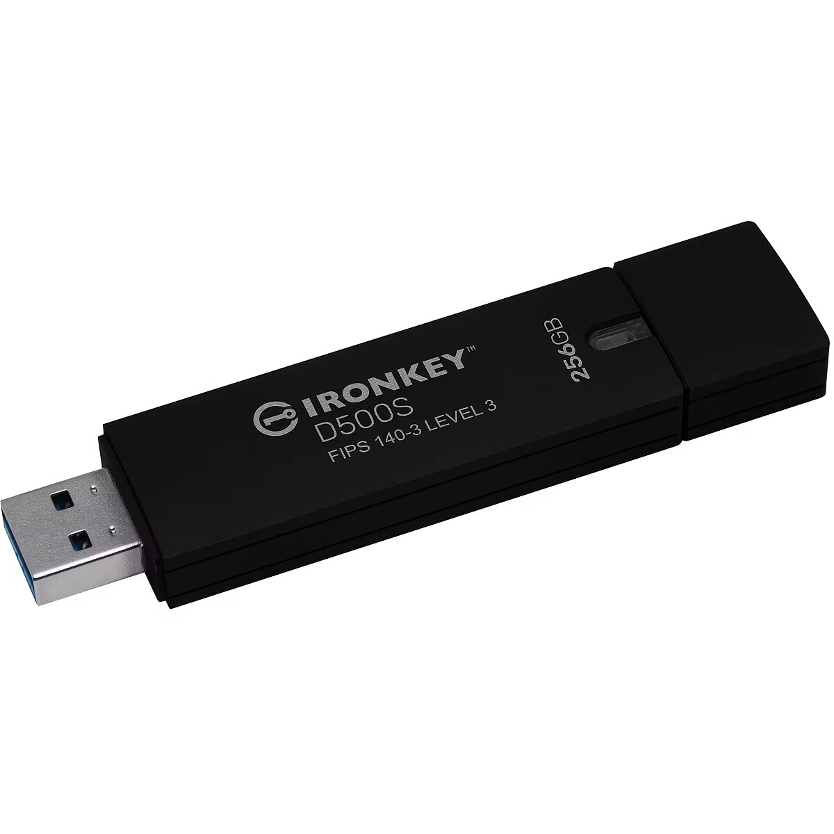 LongSummaryDescription - Kingston Technology IronKey 256GB D500S FIPS 140-3 Lvl 3 AES-256. Capacity: 256 GB, Device interface: USB Type-A, USB version: 3.2 Gen 1 (3.1 Gen 1), Read speed: 240 MB/s, Write speed: 170 MB/s. Form factor: Cap. Password protection. Weight: 50 g. Product colour: Black