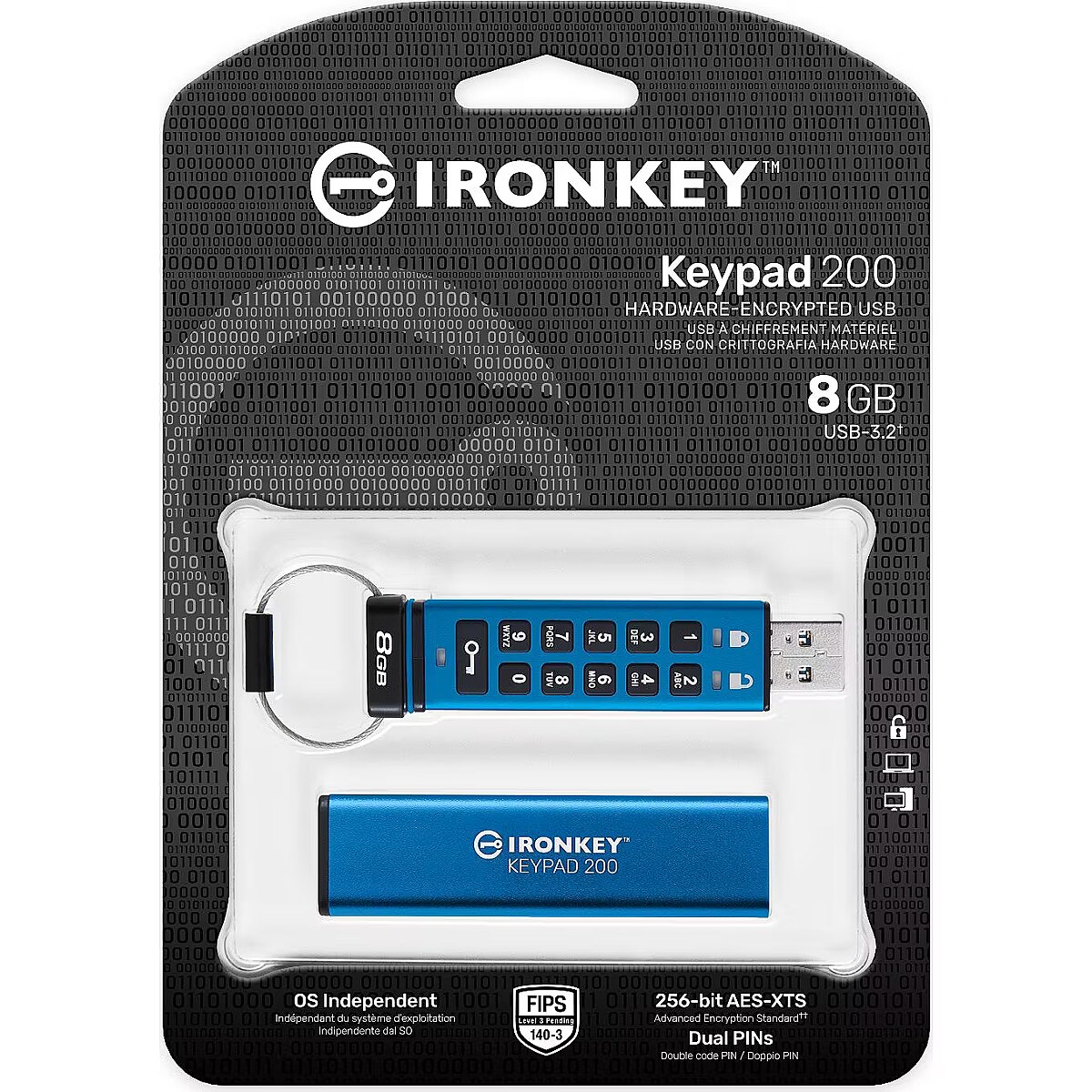 LongSummaryDescription - Kingston Technology IronKey 8GB Keypad 200, FIPS 140-3 Lvl 3 AES-256 Hardware Encrypted. Capacity: 8 GB, Device interface: USB Type-A, USB version: 3.2 Gen 1 (3.1 Gen 1), Read speed: 145 MB/s, Write speed: 115 MB/s. Form factor: Sleeve. Keypad integrated, Password protection. Weight: 25 g. Product colour: Blue