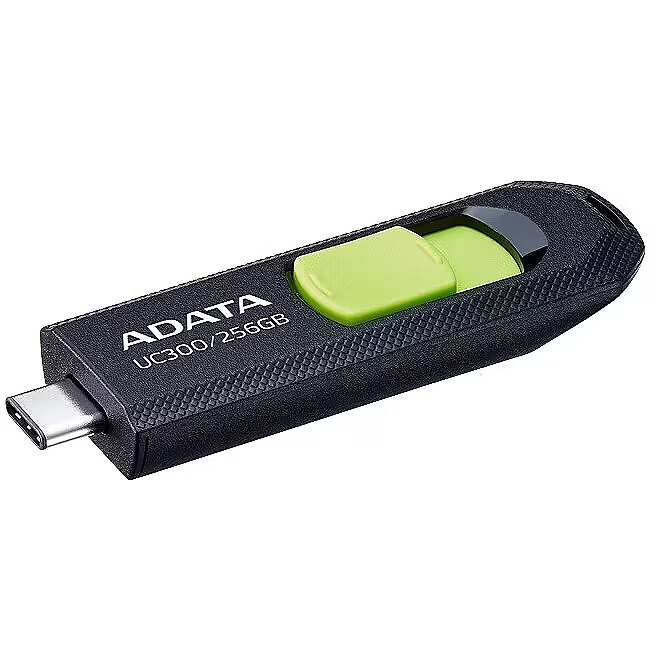 LongSummaryDescription - ADATA UC300. Capacity: 256 GB, Device interface: USB Type-C, USB version: 3.2 Gen 1 (3.1 Gen 1), Read speed: 100 MB/s. Form factor: Slide. Weight: 7 g. Product colour: Black, Green