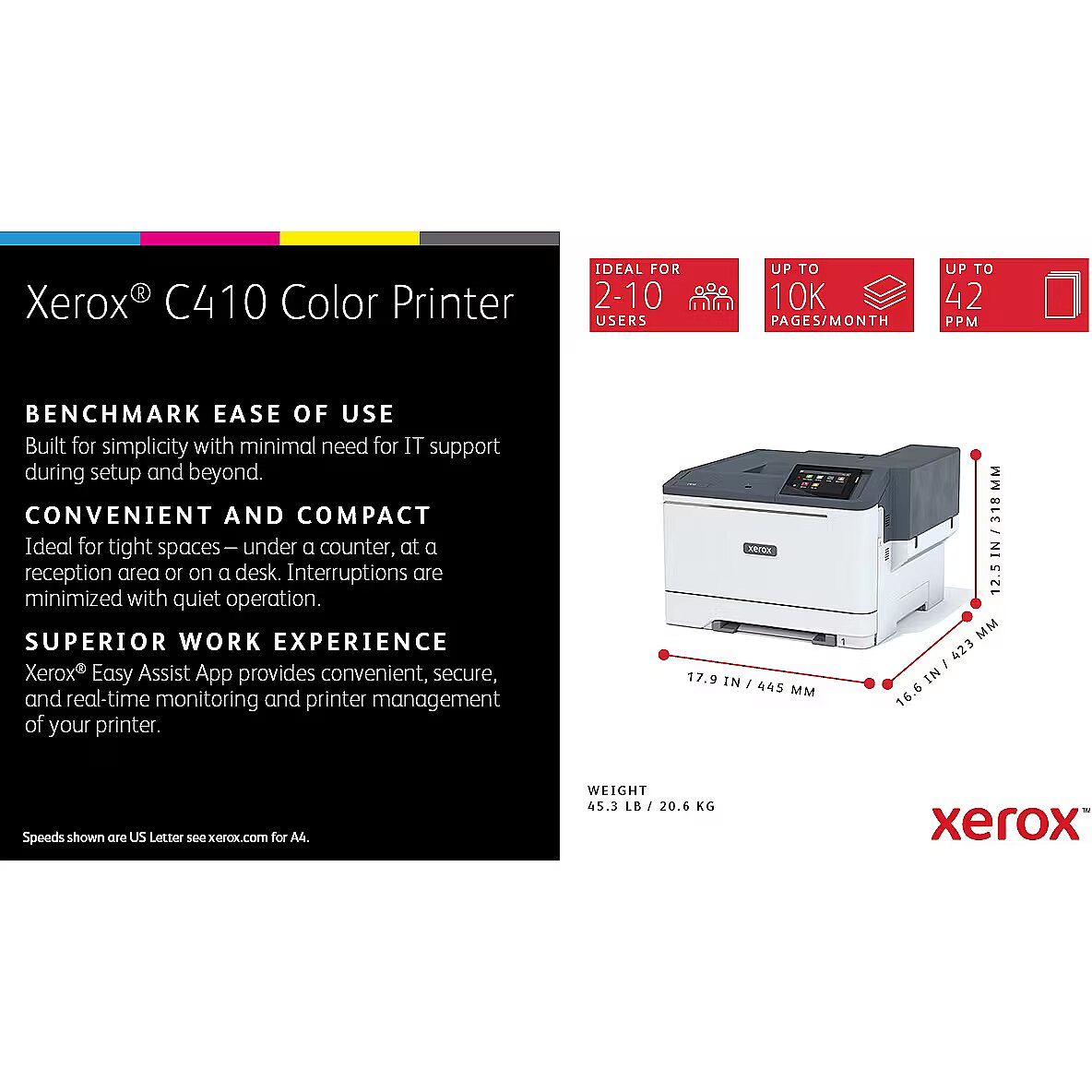 LongDesc - £100 CashbackXerox® C410 Colour PrinterReady to take the hassle out of hard work? The Xerox® C410 Color Printer provides everything you need and nothing you don’t to get more done — right-sized functionality, fast print speeds, high-quality color output and optional Wi-Fi. Perfect for small to midsize work teams that need dependable printing, the C410 Printer is ready for business right out of the box. The Xerox® Easy Assist App provides guided Wi-Fi setup from the convenience of your mobile phone. That means you get on with your day and start printing in minutes and not hours — all with minimal IT support. Conveniently compact and quiet, time and office space are at the top of your list of priorities. And now you can get more out of both. Ideal for point-of-need and tight office spaces, the C410 Printer is quiet, lightweight and has a small footprint. Whether it's under a counter, at a reception area or on a desk, these right-sized printers fit exactly where you need them. Think you need to call IT for maintenance or troubleshooting? Think again. Advanced tools such as Xerox® Easy Assist, Xerox Print Drivers, and the Xerox® Print and Scan Experience provide enhanced productivity features and offer a better way to install, use, monitor and manage your printer. In addition, the C410 Printer is made for mobile workers like you with built-in support for Apple® AirPrint®, Mopria and optional Wi-Fi Direct®. And, with the ability to print Microsoft Office files directly from a USB drive, it's even easier to keep work moving. Shrink your eco impact with the C410 Printer. Made from up to 25% of post-consumer recycled plastic, these printers meet or exceed the highest global standards for environmental performance, including ENERGY STAR and EPEAT®. They minimize paper waste with Earth Smart Printing, and the Xerox® Green World Alliance® program simplifies collection, reuse, and recycling for spent imaging supplies.¹ Print quality that can’t be missed, the high resolution of the C410 delivers vibrant colors, crisp text and sharp lines so your important documents look their best.