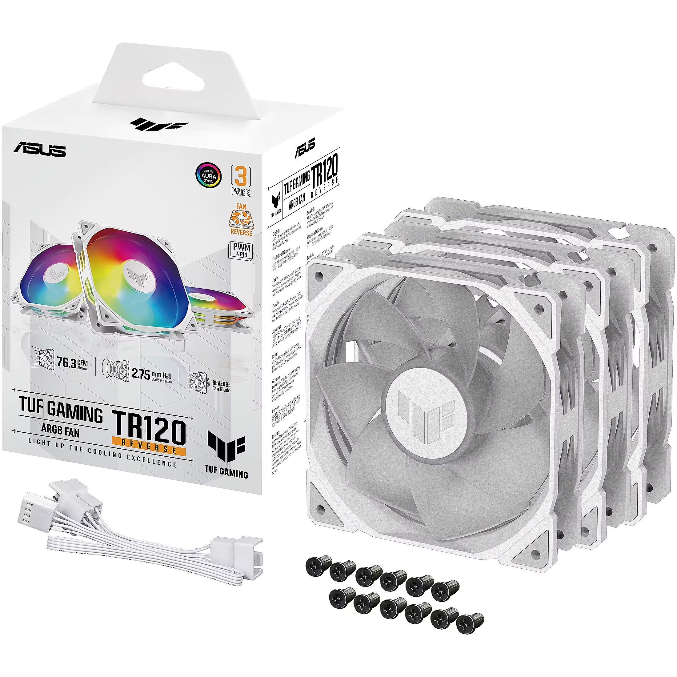 LongDesc - MASTER OF COOLING AND STYLETUF GAMING TR120 ARGB REVERSEThis case fan stands out with its extra-thick 28mm fan frame, and it is meticulously crafted to provide optimal static pressure and airflow, ensuring heightened cooling performance. Its double-layered LED array and flexible side patterns, synchronized through Aura Sync, are tailor-made for your panoramic chassis or radiators. TUF Gaming TR120 ARGB Reverse offers dual colors and orientations, giving you the versatility to master both cooling efficiency and style for your gaming rigs.THICKER FRAME FOR HIGHER PERFORMANCEFeaturing an extra-thick 28mm fan frame, the TUF Gaming TR120 ARGB Reverse case fan establishes a robust foundation, ensuring the delivery of optimal cooling performance.OPTIMIZED COOLING PERFORMANCETUF Gaming TR120 ARGB Reverse is meticulously optimized, boasting an impressive 2.75 mmH2O static pressure and a class-leading airflow of 76.3 CFM. Crafted to excel in both chassis and radiator applications, it sets a new standard for cooling performance. The reverse fan blade offers increased flexibility and enhanced airflow control for planning your chassis air channel.PWM FAN EFFICIENCYUnder the same noise performance, TUF Gaming TR120 ARGB Reverse ensures higher PQ optimization and better heat outtake efficiency in ASUS gaming case.PWM support offers precise fan control via a wide speed adjustment range of 0 to 2000 RPM. You can select silent operation for lighter loads and maximum airflow for more demanding activity.CRAFT YOUR UNIQUE STYLEDOUBLE-LAYER LED ARRAYThe TR120 features an addressable double-layer LED array that emits light evenly through each fan blade, leaving ordinary RGB fans looking washed out.DUO SIDE PATTERNSIncorporated with dual side lighting patterns, this feature allows for a diverse range of captivating visual displays through versatile arrangements.DUO COLORS & ORIENTATIONSThe TR120 ARGB Reverse is available in both black and white color options, as well as in standard and reverse versions. This versatility enables you to craft your gaming build with a personalized aesthetic while ensuring optimal cooling performance.MAXED COOLING, BOLD LOOKSWith standard and reverse fans, your PC build can have maximum airflow and present better ARGB Reverse lighting without aesthetic compromises.