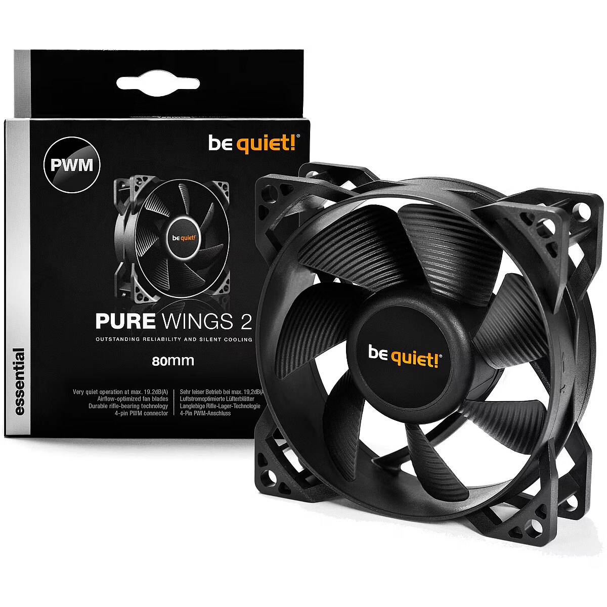 LongDesc - The Pure Wings 2 80mm PWM fans bring famous be quiet! silent cooling to entry level computing, yet are also appropriate for gaming and multimedia systems. Combining outstanding reliability, quiet operation, and a great price-for-performance ratio, Pure Wings 2 80mm PWM is unique in its class. They are the ultimate reason to put well-known be quiet! silent cooling in your PC.VERY QUIET OPERATIONAchieves a great price-for-performance ratioThe Pure Wings 2 80mm PWM fan operates at only 19.2dB(A) even at maximum speed. The perfect choice for silent home and office PCs as well as gaming and multimedia systems.SILENCE-OPTIMIZED FAN BLADESFor even better coolingThanks to its surface-optimized fan blades the airflow is enhanced, noise-generating turbulences are minimized and the air pressure is increased. This feature is the key to effective cooling.VARIABLE FAN SPEED FUNCTIONVaries the fan speed and noise level of the fanPulse Width Modulation (PWM) allows compatible 4-pin controllers - including those built into many motherboards - to intelligently vary the speed and thus the noise level of the fan. With PWM your system can ramp up the cooling when it’s needed, or operate in maximum quiet mode when it’s not.RIFLE BEARING TECHNOLOGYGives the fan a very long lifespanThe Pure Wings 2 80mm PWM is the hallmark of outstanding reliability. This is achieved by its high-quality rifle bearing technology, which assures a very long lifespan of up to 80,000 hours.