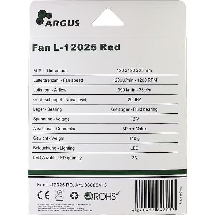 Technical_details - Dimensions: 120x120x25mm revolutions: 1200rpm Air flow: 59.5m3/?h Volume: 20dB(A) Fan bearing: hydrodynamic Slide bearing Connector: 3-Pin, 4-pin molex Voltage Range: 12V Power consumption: 3.9W Special features: red illuminated, vibration damper Warranty: two years