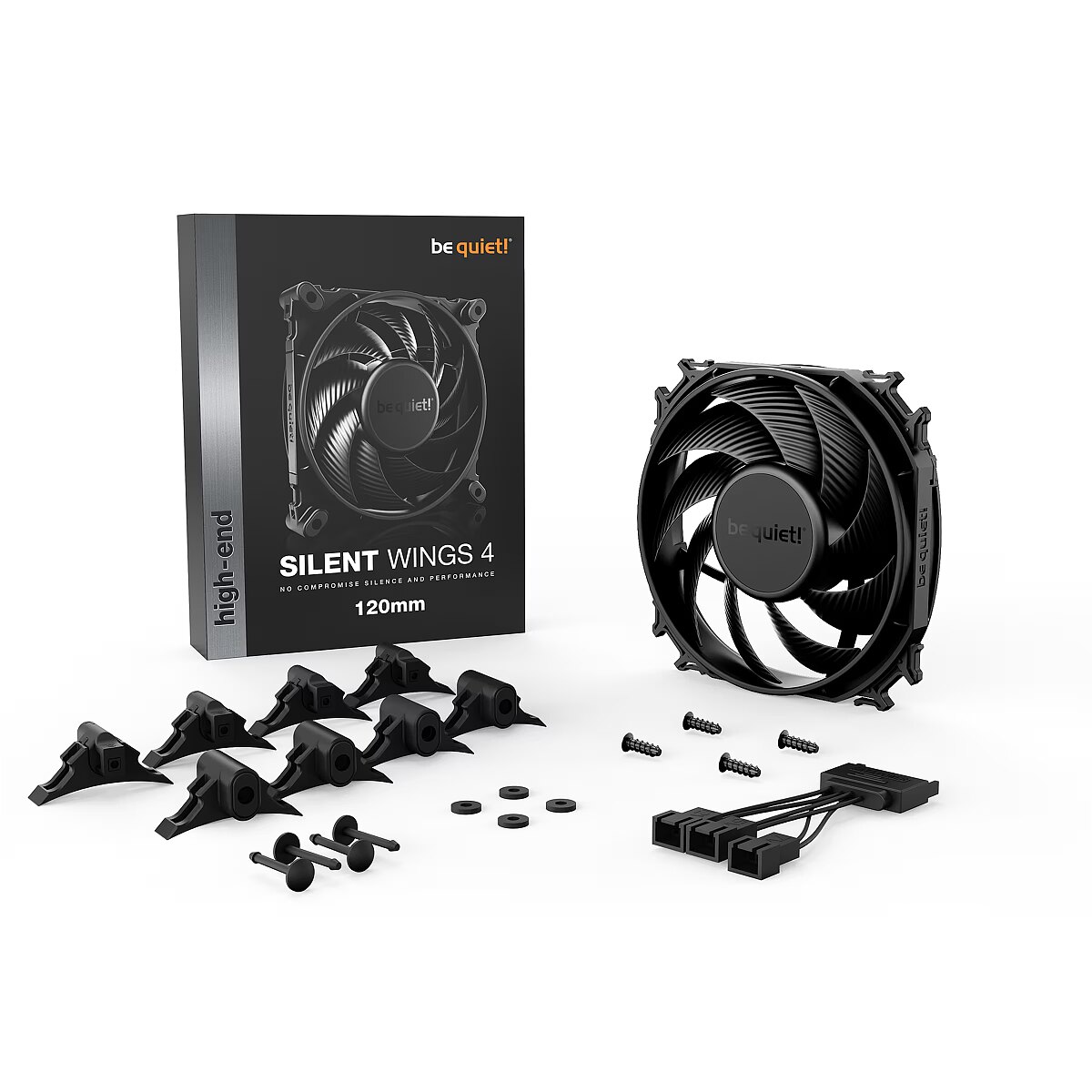 Description - SILENT WINGS 4 120mm NO COMPROMISE SILENCE AND PERFORMANCE Silent Wings 4 120mm combines all features of a virtually inaudible with an extremely performant fan for the most demanding applications. Optimized fan blades for the highest performance Small tip clearance and a fan frame with funnel-shaped air outlets for extremely high air pressure Virtually inaudible operation at regular speed 6-pole fan motor and fluid-dynamic bearing for less vibration and very smooth operations Anti-vibration mounting with push pins and screwed installation option Super-long lifespan of up to 300,000h Elegant look with high-grade fan sticker in an all-black design