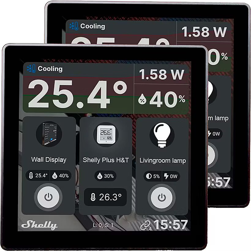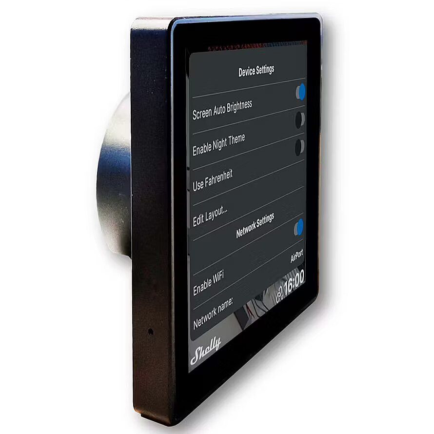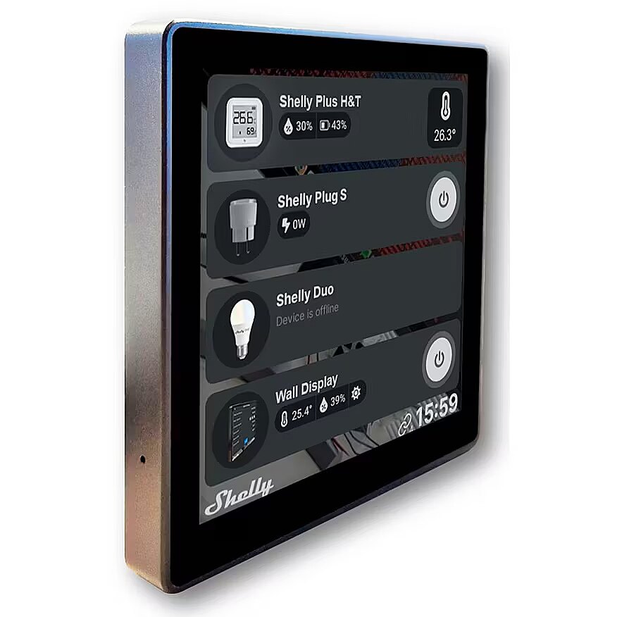 Technical_details - The Shelly Wall display is a smart home control panel with a color display and load circuit switching function. With its minimalist look, a sophisticated UI design and a highly customizable home screen, this display not only fits perfectly into any interior, but also adapts to the needs of the user. The devices used in the household can be monitored and controlled via the color touch display - scene control and scheduling, together with integration for the Shelly Smart Control app, make handling easier. The integrated relay enables lighting control and the power consumption of all devices can also be monitored. The integrated sensors and a room thermostat allow further adjustment of the room climate directly on the device. Item no.: 100031187 Type of control panel Color: Black EAN 4250494929011 Manufacturer no. BUSHWDB Smart home Alexa, Google Home, Homey, Samsung SmartThings, WiFi Device features Note Integrated temperature, humidity and LUX sensors for monitoring and automation Max. transmit (building) 30 m Features touchscreen Indoor use Wi-Fi 802.11 b, 802.11 g, 802.11 n Max. transmission range (free field) 50 m Operating temperature range -20 - 40 °C Bluetooth connection type Radio frequency from 2,400 MHz to 2,495 MHz Further information Functions: easy navigation by swiping right/left, device activation by tapping with more than one finger, Bluetooth gateway, monitoring the power consumption of all devices, Bluetooth 4.2 Dimensions Width: 85mm x Height: 85mm x Depth/Length: 30mm
