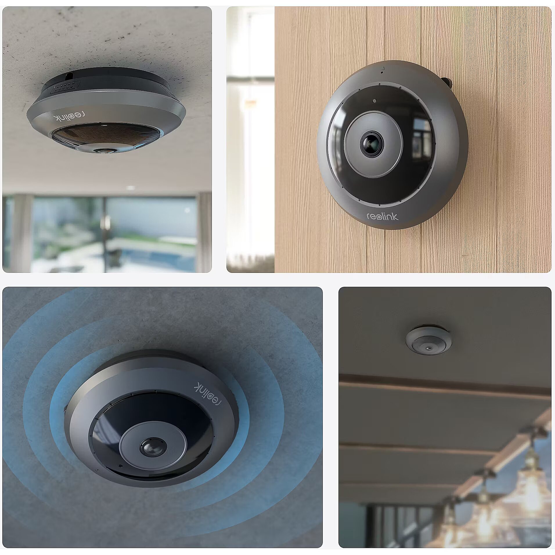 ShortSummaryDescription - Reolink Fisheye Series W520 - 6MP Indoor Fisheye Wi-Fi Camera, 360° View, Multiple Display Modes, Person Detection, IP security camera, Indoor, Wired & Wireless, Google Assistant, Ceiling/wall, Black, Grey