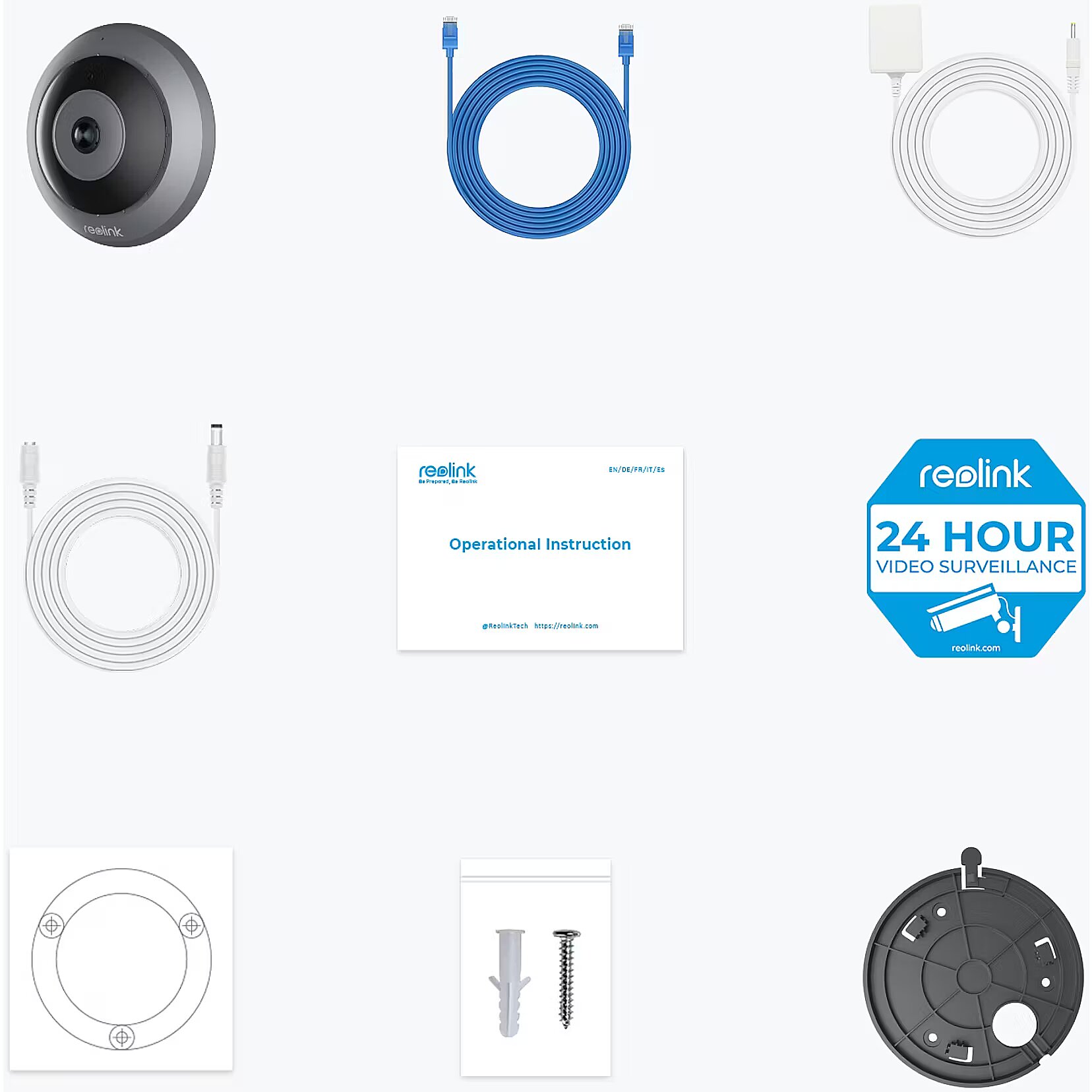 LongSummaryDescription - Reolink Fisheye Series W520 - 6MP Indoor Fisheye Wi-Fi Camera, 360° View, Multiple Display Modes, Person Detection. Type: IP security camera, Placement supported: Indoor, Connectivity technology: Wired & Wireless. Mounting type: Ceiling/wall, Product colour: Black, Grey. Lens viewing angle, horizontal: 180°, Lens viewing angle, vertical: 180°, Lens viewing angle, diagonal: 180°. Sensor type: CMOS, Optical sensor size: 25.4 / 2.5 mm (1 / 2.5"). Fixed focal length: 1.98 mm