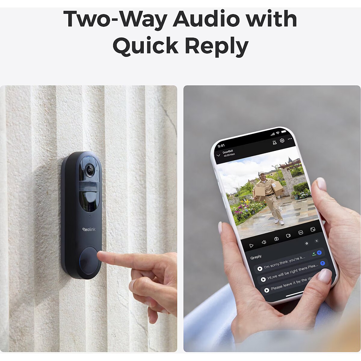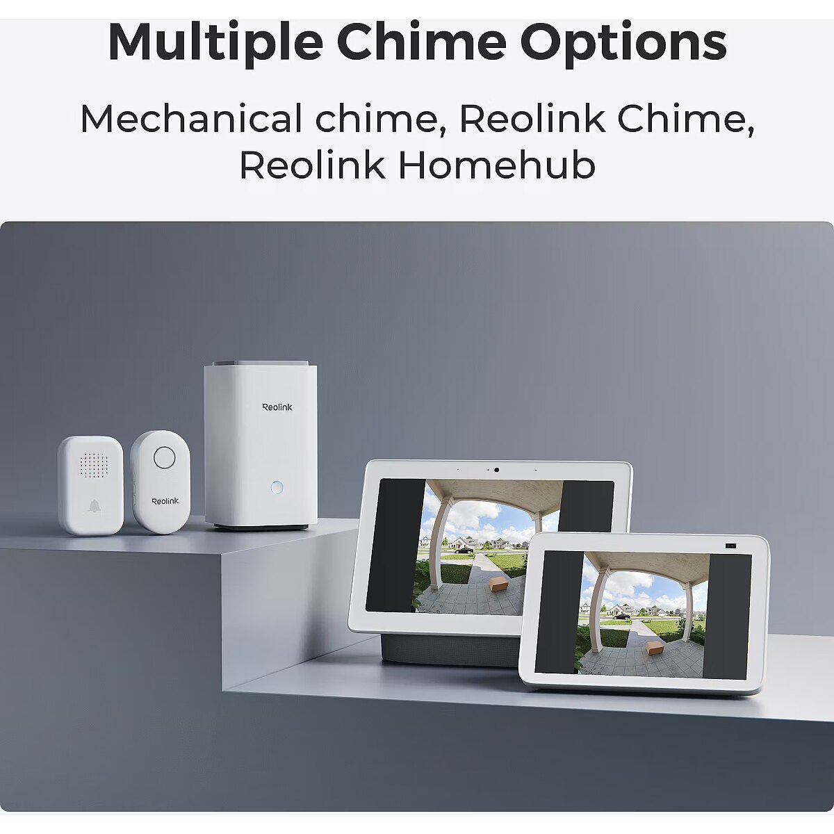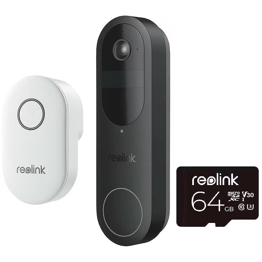 LongDesc - Reolink D340B with Chime and 64GB SD Card offers a high-resolution 4MP camera with a sweeping 150°x150°x180° head-to-toe view for comprehensive visibility. With smart detection for people, vehicles, and packages, you’ll always stay informed of what’s happening around your home. Engage instantly with visitors using the two-way audio feature, while the paired Chime ensures you receive alerts throughout your home, so you never miss an important notification. The included 64GB SD card provides ample local storage, allowing you to securely save and review footage whenever needed.1:1 Aspect Ratio + 4MP HDExperience 2K HD with a unique 1:1 aspect ratio, delivering a 150°x150°x180° head-to-toe view for exceptional front door visibility.Smart Detection + Instant AlertsWhen people, vehicles, or packages are detected, you will be notified by the real-time notification. Fear no more porch pirates, your packages are always under monitoring.Rechargeable Battery + HardwireFlexible power options. Use the rechargeable battery or hardwire to existing wiring. The hardwire option supports mechanical chimes. (Power source: 8~24V, 5VA-40VA).Dual-Band Wi-Fi NetworkSupports both 5GHz and 2.4GHz Wi-Fi., meeting your diverse connectivity needs. 2.4GHz band offers extensive coverage, while 5GHz frequency delivers rapid network speeds.Visitor NotificationReceive instant push notifications and even a video call when a visitor presses the doorbell. See their faces on the screen without having to open the door.Multiple Chime OptionsWhether you opt for Reolink Chime, a traditional mechanical chime, Google Assistant, or Reolink Home Hub, rest assured that our doorbell will complement your home environment.Two-Way Audio + Quick ReplyEngage in real-time communication with visitors via two-way audio. Pre-recorded quick replies add convenience, letting them speak for you whenever needed.Reliable Guardian in Any WeatherDesigned to withstand the elements, this weatherproof doorbell provide reliable outdoor protection against dust and water.HDR TechHDR technology dynamically adjusts the exposure to enhance image quality, ensuring clear and detailed visuals even in challenging lighting conditions.Chime and 64GB SD card includedThe Chime provides instant audible alerts throughout your home, ensuring you never miss a visitor or motion notification. The 64GB SD Card offers generous local storage, allowing you to store video footage directly on the device without needing a cloud subscription.