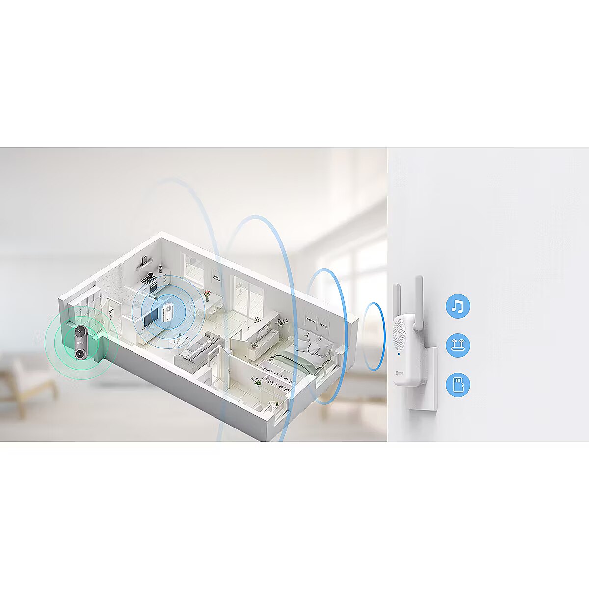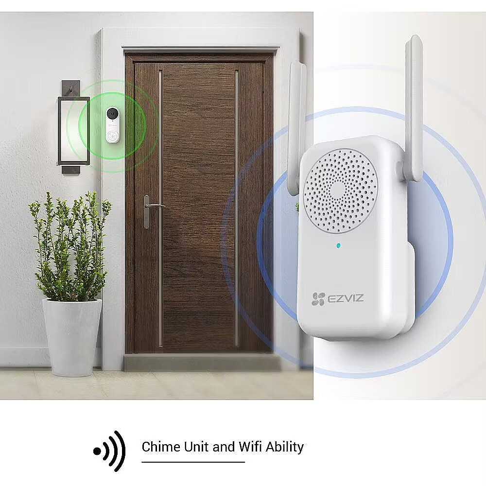 Et kuulda uksekella helinat ka kaugemal, on EZVIZ komplekti lisanud sisehelina. Helin laiendab ka WiFi-signaali, tugevdades uksekella ühendust stabiilsuse tagamiseks – paljudel juhtmeta uksekelladel võib stabiilsest ühendusest puudust olla.