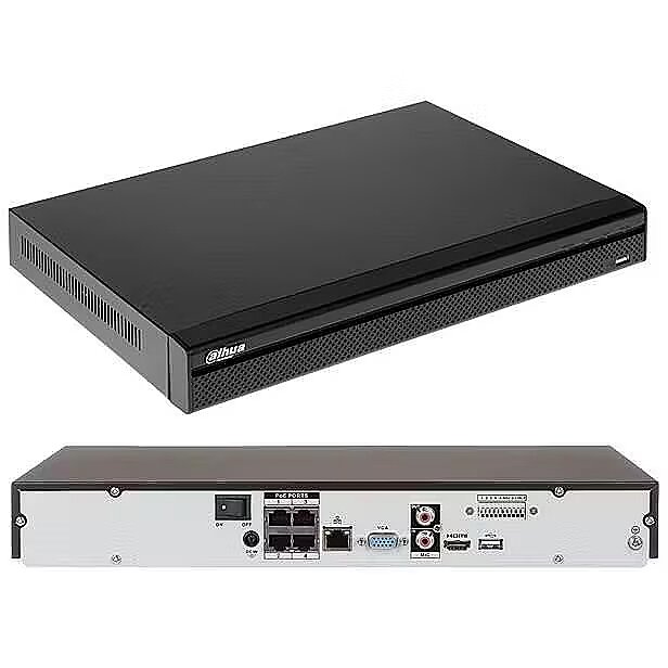 Description - 4 IP channel max, up to 8MP resolution Max: 160Mbps recording bandwidth, Smart H.265/H.265/Smart H.264/H.264/MJPE VGA/HDMI up to 4K output, decoding 4 × 1080p @ 30 fps 2 SATA III ports, up to 10 TB for a single HDD No front panel control, 4/2 alarm I/O, 2 USB, Two-way Talk: 1/1 I/O 4 PoE ports: Total output power of PoE is 36W, the maximum output power of a single port is 25.5W Desktop mounted chassis AI by Camera: Face detection, perimeter protection, IVS, people counting, heat map, and SMD Free IP monitoring software available, ONVIF(profile T/S/G); CGI; SDK Other brands IP cameras supported