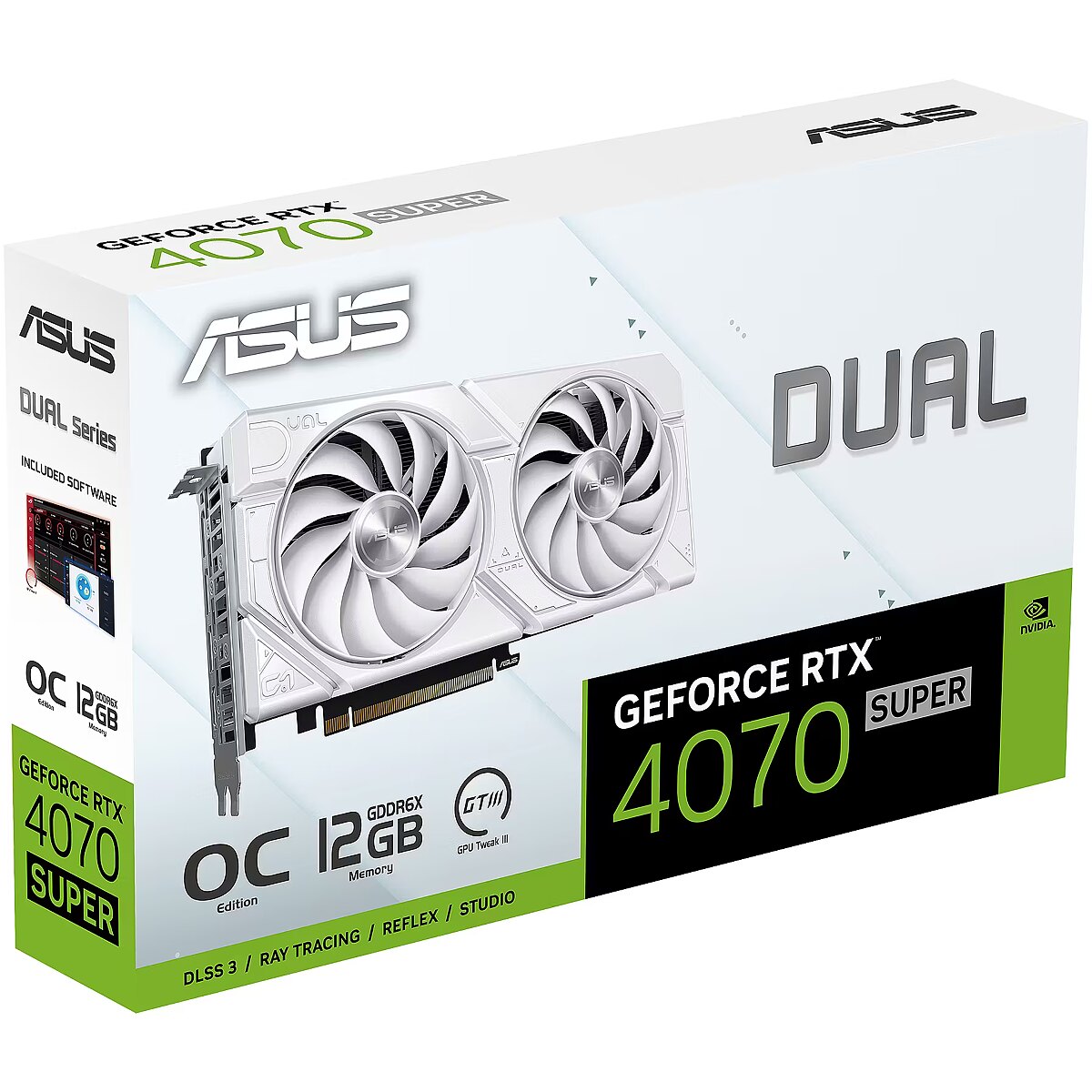 LongDesc - 2x Fans. 2x Fun.ASUS Dual GeForce RTX™ 4070 SUPER EVO White Edition fuses dynamic thermal performance with broad compatibility. Advanced cooling solutions from flagship graphics cards — including two Axial-tech fans for maximizing airflow to the heatsink — are packed into the 22.7 cm long, 2.5-slot card, delivering more power in less space. These enhancements make ASUS Dual the perfect choice for gamers who want heavyweight graphics performance in a compact build.Axial-tech Fan DesignBetter, faster, strongerTwo tried-and-true Axial-tech fans feature a smaller hub that facilitates longer blades and a barrier ring to increase downward air pressureAuto-Extreme TechnologyPrecision automated manufacturingAuto-Extreme Technology is an automated manufacturing process that sets new standards in the industry by allowing all soldering to be completed in a single pass. This reduces thermal strain on components and avoids the use of harsh cleaning chemicals, resulting in less environmental impact, lower manufacturing power consumption, and a more reliable product overall.GPU Tweak IIIMonitor, tweak, and tuneASUS GPU Tweak III is more intuitive and feature-rich than ever before. A revamped interface offers greater accessibility by integrating core functions into a centralized dashboard, and our Voltage-Frequency tuner has been overhauled to make overclocking even easier. Additional goodies like 0dB fan technology, automatic profile swapping, a fully customizable on-screen display, and logging capabilities ensure that you get the most out of your graphics card.144-hour Validation Program"Extensive" may be an understatementA 144-hour validation program puts cards through a series of stringent tests to ensure compatibility with the latest games.Pair with a PSUUse our wattage calculator to estimate how much power you’ll need to fuel your rig, and then pick a compatible ROG Thor, ROG Loki or ROG Strix AURA power supply for ultimate performance.NVIDIA DLSS 3Max FPS. Max Quality. Powered by AI.DLSS is a revolutionary breakthrough in AI graphics that multiplies performance. Powered by the new fourth-gen Tensor Cores and Optical Flow Accelerator on GeForce RTX 40 Series GPUs, DLSS 3 uses AI to create additional frames and improve image quality.Further With AI, Faster on RTX.Get next-level AI performance on GeForce RTX.Discover the RTX AI advantage. Built for the era of AI, GeForce RTX™ GPUs feature specialized AI Tensor Cores that deliver cutting-edge performance and revolutionary capabilities. From enhanced creativity and ultra-efficient productivity to blisteringly fast gaming, the ultimate in AI power on Windows PCs is on RTX.