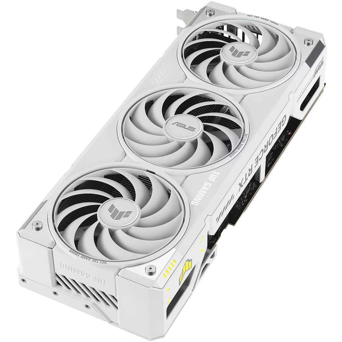 Kątowy widok z przodu TUF Gaming GeForce RTX 5070 Ti White Edition przedstawiający potrójne wentylatory i oświetlenie ARGB