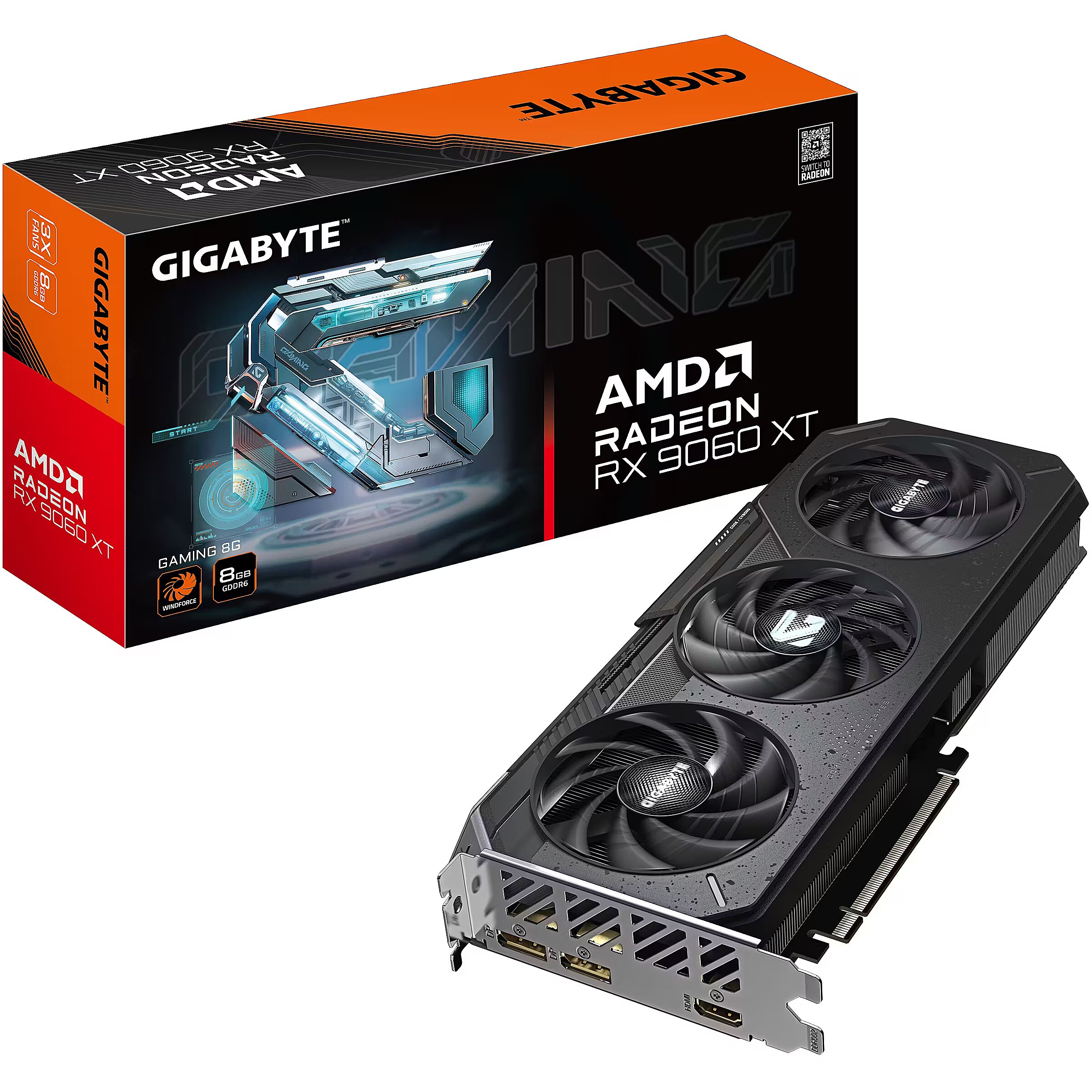 LongSummaryDescription - GIGABYTE Radeon RX 9060 XT GAMING 8G Graphics Card - 8GB GDDR6, 128bit, PCI-E 5.0, 3130 MHz Core Clock, 2 x DisplayPort, 1 x HDMI, GV-R9060XTGAMING-8GD. Graphics processor family: AMD, Graphics processor: Radeon RX 9060 XT. Discrete graphics card memory: 8 GB, Graphics card memory type: GDDR6, Memory bus: 128 bit, Memory clock speed: 20000 MHz. Maximum resolution: 7680 x 4320 pixels. DirectX version: 12.0, OpenGL version: 4.6. Interface type: PCI Express 5.0. Cooling type: Active, Number of fans: 3 fan(s)