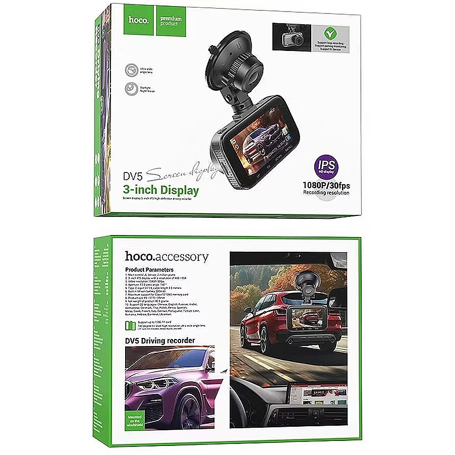 description_ru - Автомобильная камера Hoco Driving DV5 с сенсором GC2053 с разрешением 2 млн пикселей, которая записывает видео в разрешении 1080P при 30 кадрах в секунду, что позволяет получать плавные и яркие записи. Встроенный 3-дюймовый IPS HD-дисплей позволяет постоянно контролировать обстановку вокруг автомобиля, а широкий угол обзора в 140 градусов обеспечивает широкое поле зрения.