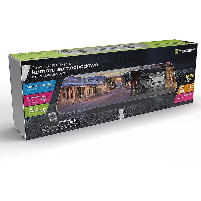 Description - Kamera samochodowa TRACER 4.0D FHD MENSA (G-sensor, parking, motion, rear) Kamery samochodowe możemy spotkać już w niemal co trzecim aucie. Dla wielu kierowców jest to niezbędny kompan podróży, takie "trzecie oko", które dostrzega i zapamiętuje wiele nawet drobnych szczegółów z przebiegu podróży. Wideorejestrator zapewnia zabezpieczenie w formie niepodważalnego dowodu w przypadku stłuczki, wypadku lub próby wyłudzenia ubezpieczenia przez nieuczciwego kierowcę bądź innego użytkownika drogi. Z Tracer Mensa możesz czuć się pewnie i bezpiecznie. Kamera przednia Full HD 1920x1080, 30 fps, kąt 150 stopni Kamera wsteczna HDR Duży ekran IPS 4,0" Wideorejestrator w formie płaskiego, eleganckiego lusterka Czujnik G-sensor Tryb parkingowy Nagrywanie w pętli Wbudowany mikrofon Detekcja ruchu Nagrania wysokiej rozdzielczości Full HD