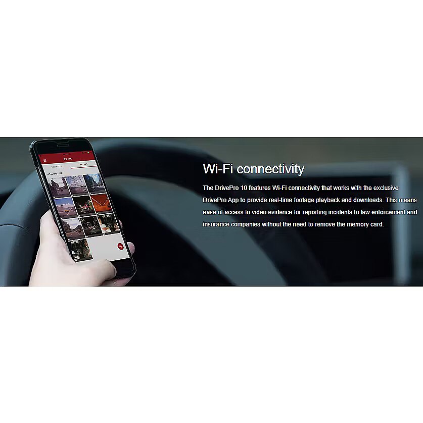 Supporting 1440P 2K QHD recording at 30fps, the DrivePro 10 will give you footage as smooth as butter. You can zoom in on any shot and easily make out crucial details, such as license plates. Wi-Fi connectivity