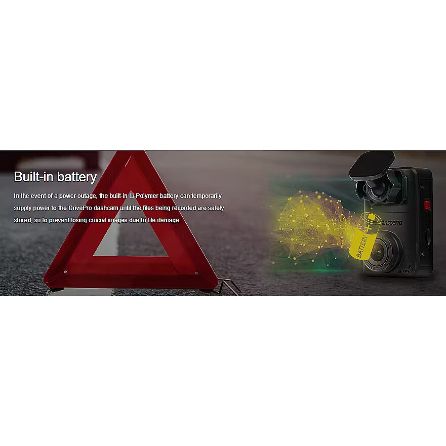 In the event of a power outage, the built-in Li-Polymer battery can temporarily supply power to the DrivePro dashcam until the files being recorded are safely stored, so to prevent losing crucial images due to file damage. Format-free technology