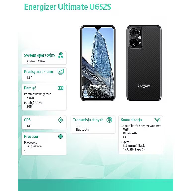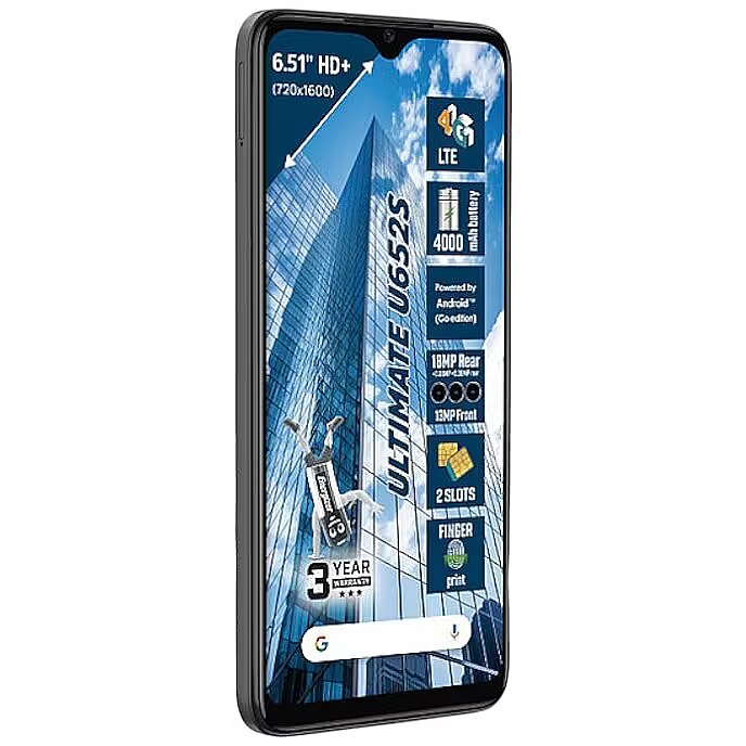 Description - Display The smartphone features an impressive 6.51-inch HD+ (1600x720) TFT IPS display that delivers vivid colors and wide viewing angles. Perfect for watching videos, browsing the web, and using apps in a convenient way.   Processor and memory The smartphone is powered by a quad-core MediaTek MT6739WW processor (1.5 GHz) supported by 2 GB RAM, which ensures smooth operation in everyday tasks. 64 GB of internal storage allows you to store a large number of photos, applications and files.   Long-lasting battery The 4000 mAh battery provides up to 18 days of standby time and up to 40 hours of 4G talk time, making it the perfect companion for travel and busy days.   Professional photos and videos A set of rear cameras (18 MP + 0.08 MP + 0.08 MP) with autofocus and a 13 MP front camera allow you to capture beautiful photos and videos. The built-in flash allows you to take photos even in difficult lighting conditions.   Dual SIM The U652S smartphone can support two Mini SIM cards and one Micro-SD card up to 64GB. Increase your phone's memory and use 2 different SIM cards in one phone. You can combine 2 plans or choose two different carriers for better network coverage.   Safety and convenience The fingerprint sensor ensures quick and secure unlocking of the phone, and a set of additional sensors, such as an accelerometer, light sensor and pedometer, increase the functionality of the device.   Product Features: Large 6.51" TFT IPS (1600x720) HD+ display Processor: MediaTek MT6739WW, Quad Core 1.5 GHz ROM: 64GB Memory: 2 GB RAM Cameras: Rear 18 MP + 0.08 MP + 0.08 MP, Front 13 MP Connectivity: 4G LTE, Bluetooth 4.2, Wi-Fi 4000mAh battery Fingerprint reader Charging Port: USB-C 3.5 mm jack socket Dual Mini SIM support Expandable memory with a Micro-SD card up to 64 GB Android 13 Go operating system Additional functions: FM radio, GPS, accelerometer, light sensor, pedometer Product dimensions: 164.3 x 76 x 9 mm Manufacturer's warranty: 3 years