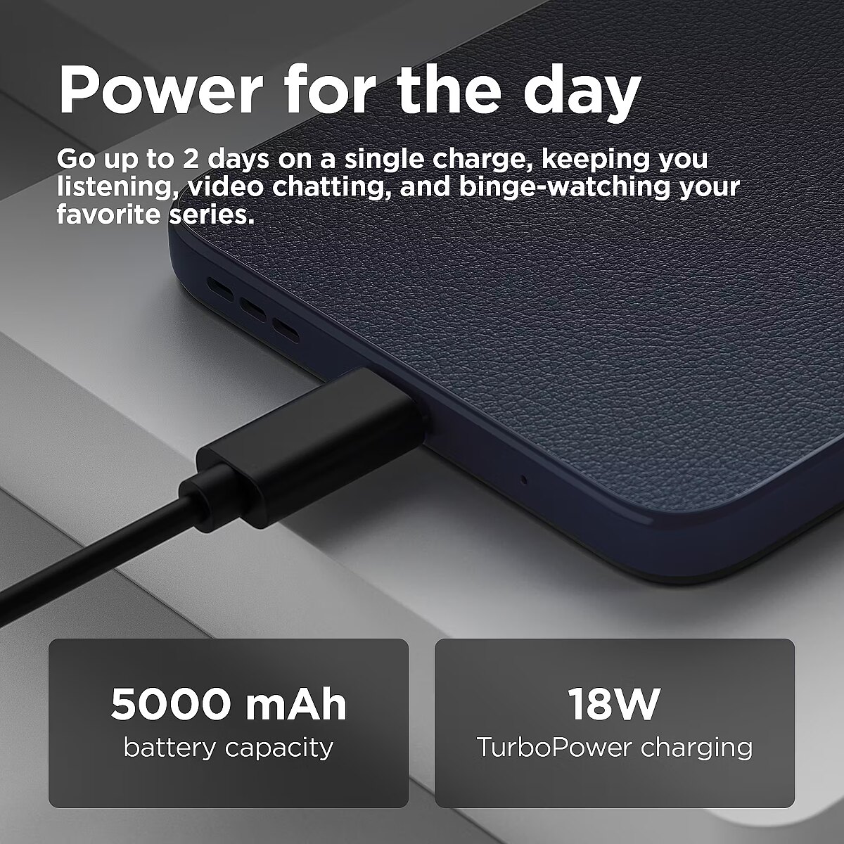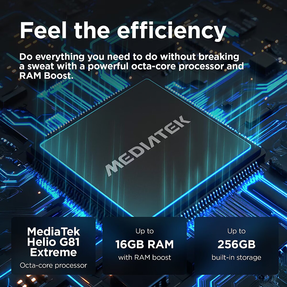 Specifications: Display: 6.67″ IPS LCD, 90 Hz Processor: MediaTek Helio G81 Cameras: 50 MP main, 8 MP front Battery: 5200 mAh, 18 W charging Protection: IP54