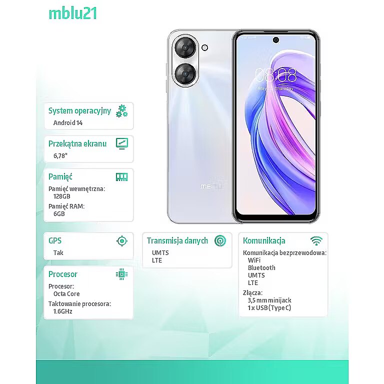 mblu21 zachwyca nowoczesnym wyglądem jego obudowa ma wyraźne, geometryczne linie, które nadają mu elegancki i uporządkowany charakter. Tył telefonu pokryty jest specjalną powłoką, która subtelnie zmienia odcień w zależności od kąta padania światła, tworząc efekt błyszczącej, promiennej tafli. Całość dopełnia duży ekran, który niemal wypełnia przednią powierzchnię telefonu, dzięki czemu korzystanie ze smartfonu staje się jeszcze przyjemniejsze i bardziej wciągające. To połączenie stylu i technologii, które przyciąga wzrok i podkreśla nowoczesny charakter urządzenia.