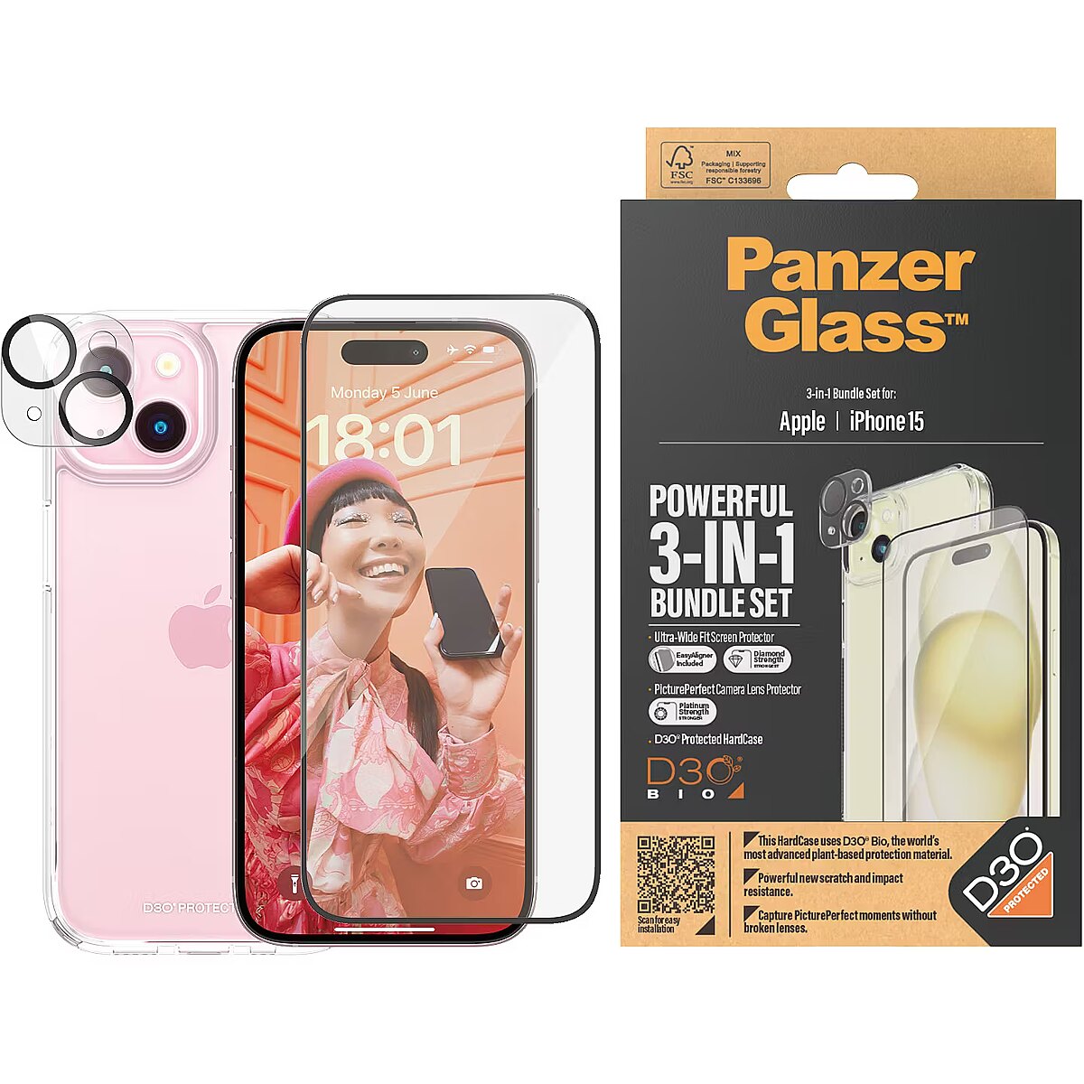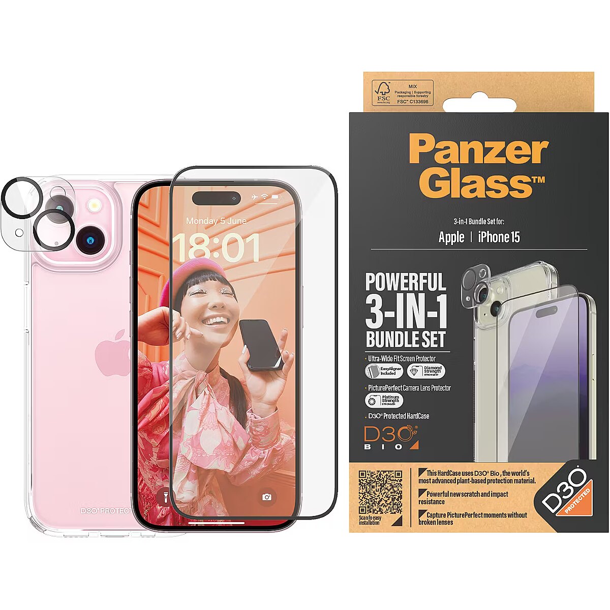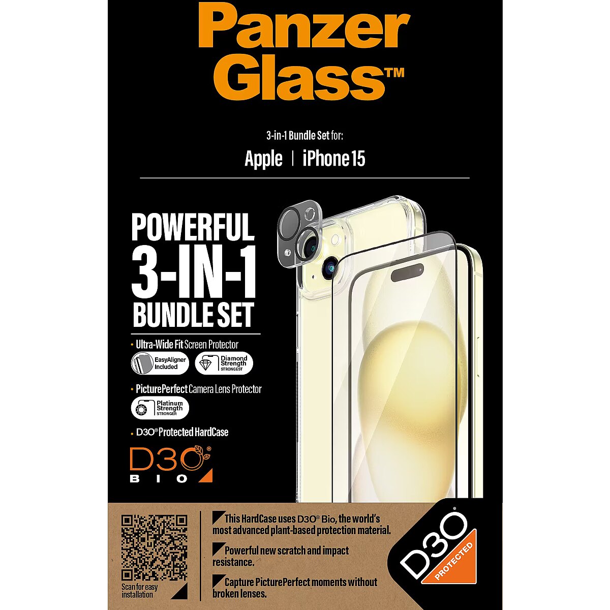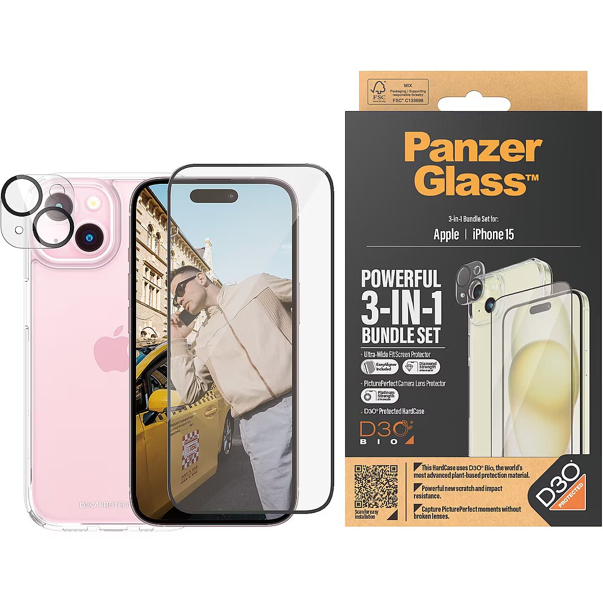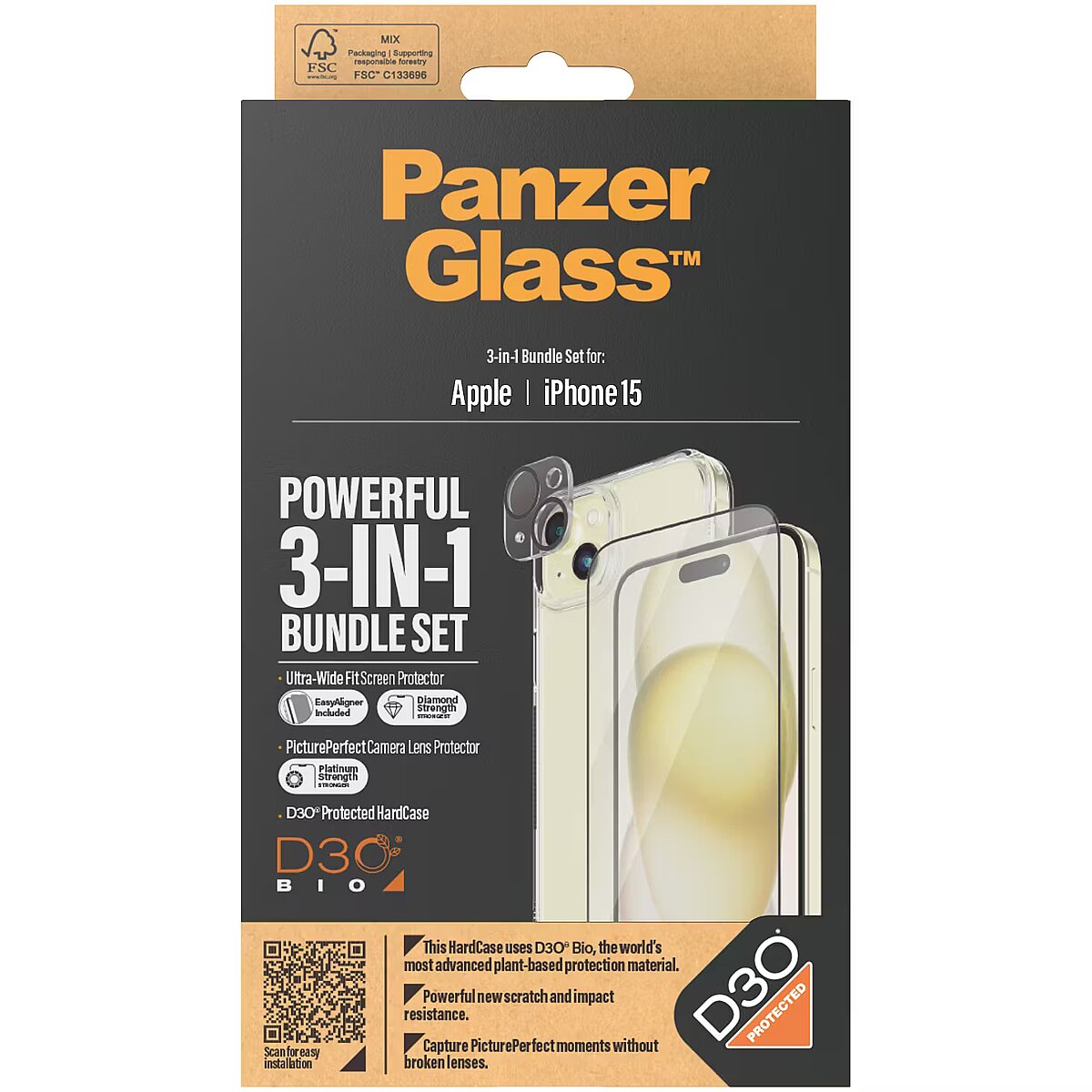 This product PanzerGlass 3-in-1 Pack iPhone 15, PicturePerfect Camera Lens Protector, a wireless charging compatible HardCase and an Ultra-Wide Fit Screen Protector