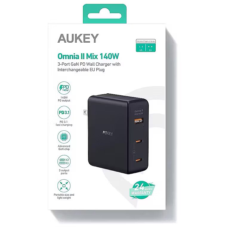 Description - AUKEY PA-B7O Black GaN Omnia II Ultra-fast wall charger 140W PPS 3xUSB (2xUSB-C and 1xUSB-A) Power Delivery 3.1 (USB-PD 3.1) (140W) GaN - the most modern solution using gallium nitride (GaN) Universal! charges phones, laptops, tablets and other devices Adapters for US, UK and EU sockets included With Power Delivery PD 3.1 fast charging technology, this charger ensures that your devices are charged in the shortest possible time, saving you time and energy. Aukey PA-B7O has a powerful 140 W Power Delivery output, which allows for effective and fast charging of even the most demanding devices. The advanced GaN chip built into the design of this charger makes it smaller, lighter and more efficient than traditional chargers, making it a convenient and practical solution for traveling or charging while on the move. This charger comes with interchangeable plugs for the US, UK and EU, making it a versatile and convenient solution for use when traveling internationally. GaN power integrated circuit 4x faster charging despite its small size Device charging is up to four times faster thanks to the advanced GaN power integrated circuit, and Dynamic Detect technology ensures optimal charging. The model is also 20% smaller and lighter than traditional 90-watt chargers. Elegance, minimalism and solid workmanship. The three-port Aukey Omnia II PA-B7O charger, with dimensions 64 x 79 x 32 mm and a weight of 268 grams, is distinguished by its interesting design and subdued black color. It fits easily with the rest of the equipment, and its portability means you can easily take it with you wherever you need it. Attention is also drawn to the high-quality materials from which this model is made, they guarantee its durability and resistance to accidental damage or scratches. The most important features: Fast charging in the Power Delivery (USB-PD) 3.1 standard Very high power of 140W - Thanks to which you can charge your devices much faster than with a standard charger 3 USB ports - (2xUSB-C and 1xUSB-A) allow you to charge 3 devices at the same time Durable and durable The charger housing is made of high-quality, durable, varnished ABS. Elegant and durable. Abrasion and scratch resistant Universal - Allows you to charge GPS devices, Bluetooth headphones, MP3 players, mobile phones, iPhone, iPad, iOS, Android, laptops and more Compact size and modern, very elegant design The control chipset adjusts the current to the device, protecting it against damage 7 levels of protection thanks to AUKEY Entire Protect and Qualcomm INOV - Against overcharging, discharge, overvoltage, overheating, overcurrent, short circuits and electromagnetic field. Complete protection of the charger, the device being charged and the network installation Power Delivery (USB-PD) 3.1 USB-C Power Delivery - this is the latest charger standard that allows the transfer of higher power (up to 140W) via the USB-C connector. Chargers with this standard can be used to power various types of devices, including laptops! Safety and very high power in a small housing The AUKEY PA-B7O mains charger dynamically adjusts the output power to the type of device. A safe charging system with variable voltage and high throughput allows you to charge modern devices in a surprisingly short time. Whether you're in a hurry to get to work or have a long journey ahead of you. For slightly older devices, the charger will slow down and charge them at a speed that is safe for them. The AUKEY EntireProtect security system will protect your equipment against overcharging, overheating and voltage changes, so you can safely charge your favorite devices anywhere. The most important thing is safety With integrated USB-IF certified PD protocol, you know your phone is in safe hands, even when fast charging is enabled. Set it and forget it Concerned about unattended fast charging? The Aukey PA-B7O charger will top up your devices until they are almost full, then switch to three-stage charging to protect your device. Modern, elegant design The Aukey PA-B7O charger is a universal gadget that you will quickly appreciate. It allows you to charge not only small devices such as a smartphone or headphones, but also to charge a laptop or an external monitor. Thanks to this, you will not have to use many different chargers - Aukey PA-B7O will be enough to make each of your devices ready to work. People who travel a lot will certainly appreciate the fact that the charger has replaceable adapters for EU, US and UK sockets, so you don't have to use additional adapters. Triple Power With three separate ports that don't lose speed during use, this device truly makes charging as easy as 1-2-3. Potential 140W PD3.1 Thanks to the PD3.1 140W technology, you shorten the waiting time and the charger charges your laptop with full efficiency. Increased Versatility This flexible charger is suitable for charging iPhones, AirPods, iPads, Android devices and even small laptops, making it a true one-stop-shop for all your charging needs.