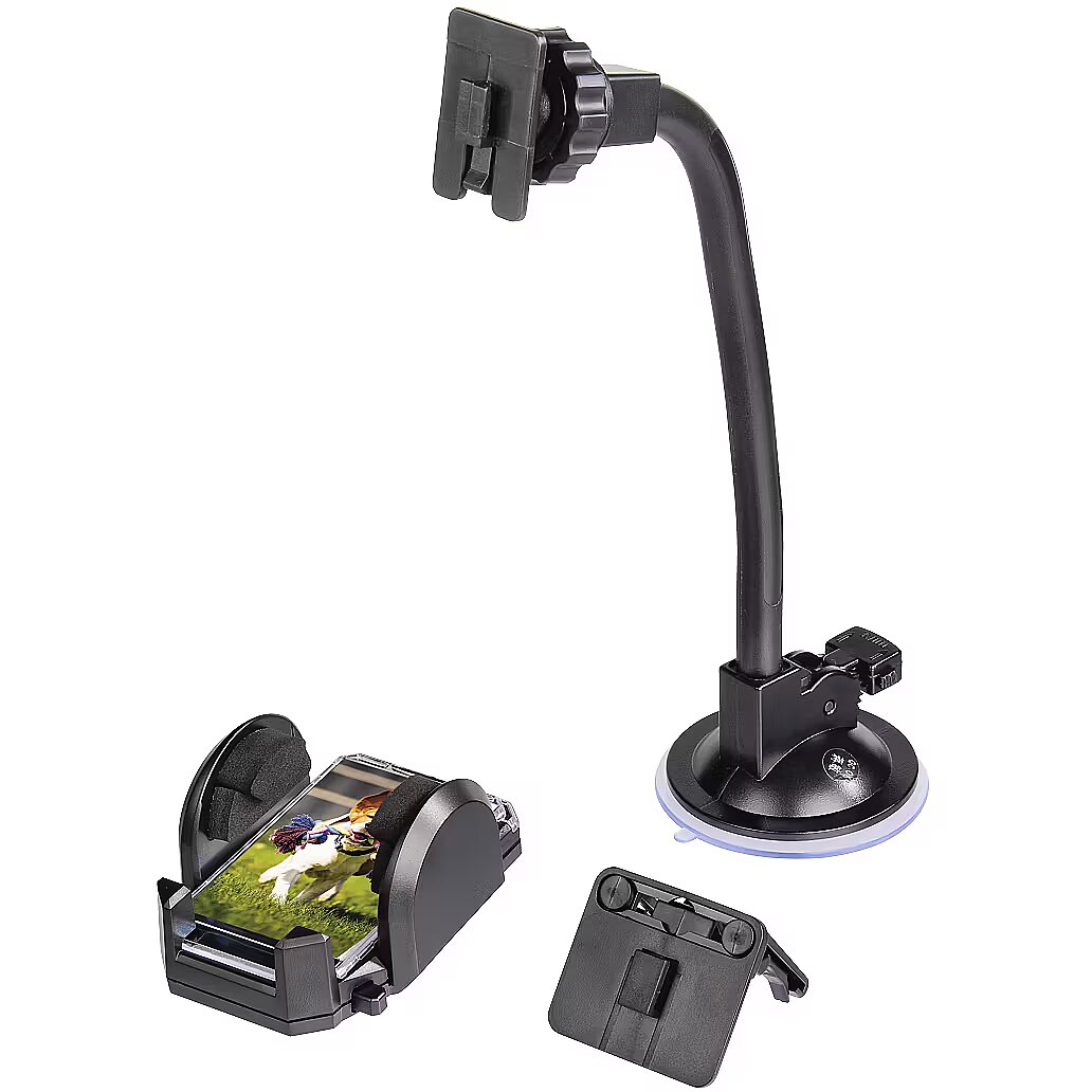 Description - Car holder Bracket set for securely attaching a smartphone to a car windscreen or grille. The holder is attached to the windshield via a long, flexible swivel arm using a suction cup, allowing maximum accessibility and positioning as desired. By changing the angle, the best view of the display is always possible, even in the sun, for example. The phone can be rotated as desired, e.g. for horizontal navigation on a smartphone. The car vent fin holder offers a safe and compact alternative for attaching a mobile phone. The car holder is compatible with smartphones between 4 and 11 cm wide. Access to the charging socket of the smartphone remains free, so that the device can also be charged while driving. The smartphone holder is mounted without gluing or drilling, so it fits into almost any car and can be easily removed if required.