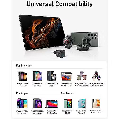 Description - Ultra High Speed: Supports up to 45W Super Fast Charge 2.0 for Samsung, so you can fully charge your Galaxy S23 Ultra in under an hour. Note: Super Fast Charging 2.0 requires a 5A charging cable (not included). Superior Security with MultiProtect: Includes a total of 10 safety features including short circuit protection, high voltage protection and temperature control to protect you and your connected devices. Powered by GaN technology: With higher energy efficiency and improved heat dissipation, gallium nitride (GaN) makes our chargers smaller and safer, without sacrificing power. Universal Compatibility: Featuring PowerIQ 3.0 technology that provides optimized charging for virtually any mobile device, including phones, tablets and more.