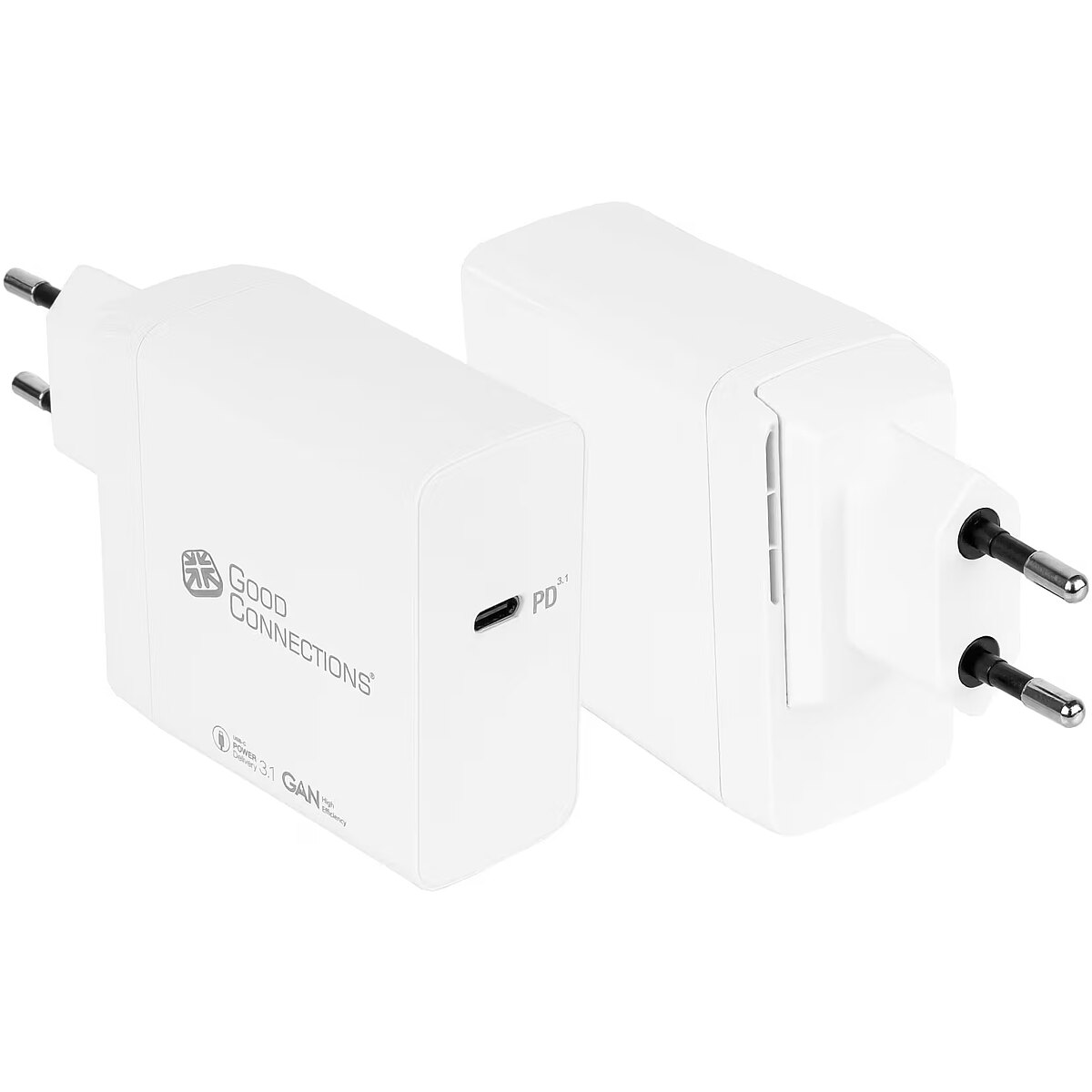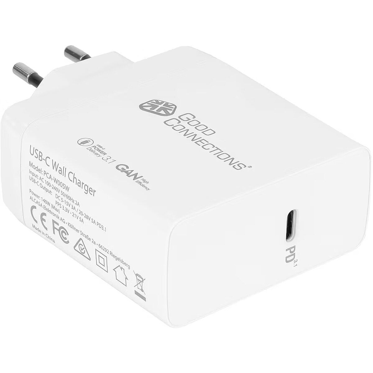 Technical_details - The Good Connections USB fast charger PCA-W005W with state-of-the-art GaN technology and the latest PD 3.1 fast charging technology is a 140 watt universal power supply for smartphones, tablets, iPad, MacBook, notebooks, monitors and accessories. It combines compact design with efficient and powerful charging technology. The lightweight USB quick charger, which can be used universally for multiple devices, supports up to 140 watts and offers significantly higher performance compared to standard chargers. Charging technologies such as Programmable Power Supply (PPS), USB-C Power Delivery 3.1 and Qualcomm Quick Charge 5 are also supported. The Good Connections fast charger uses innovative GaN technology. Silicon transistors used in conventional chargers are replaced by state-of-the-art gallium nitride transistors (GaN). These require less power and produce less heat, enabling faster and more efficient charging processes and more compact dimensions. For safe operation, the Good Connections quick charger is equipped with safety features such as integrated overvoltage protection, overcurrent protection, overload protection, overheating protection and short circuit protection. Item no.: 100025577 Charger type color white EAN 4014619880843 Manufacturer no. PCA-W005W Made in China Charging option for Apple devices, cell phones, notebooks, tablets Connections 1x USB-C Power input voltage 100 to 240 volts Output power 140 watts 1 device can be charged at the same time Power source socket Safety Short Circuit Protection (SCP), Current Surge Protection (OCP), Over Voltage Protection (OVP), Over Heat Protection (OTP), Over Load Protection (OLP/OPP) Feature Power Delivery 3.1, Qualcomm Quick Charge 5, Programmable Power Supply (PPS) Accessories available, operating instructions, USB-C charging cable 1.2m