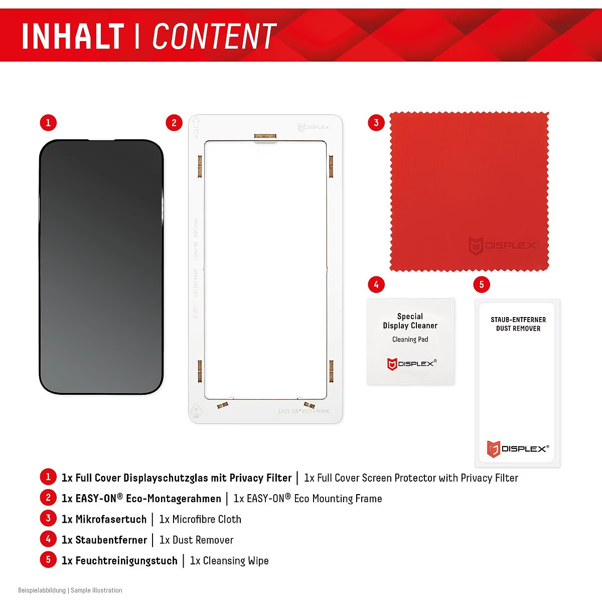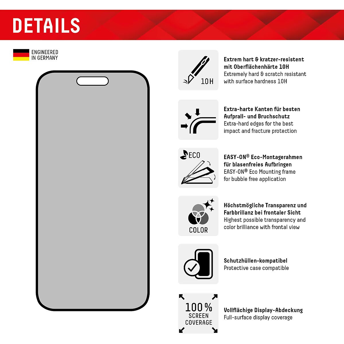 LongDesc - PRIVACY Full Cover Real Glass with EASY-ON® Eco Mounting Frame Privacy FilterThanks to the special privacy filter integrated into the protective glass, the display light is only transmitted from a certain viewing angle. This means that the screen appears black from a viewing angle of 30° or more. The glass thus offers effective protection against side glances from, for example, seat neighbours on trains, planes or buses. And all of this, of course, without any negative impact on colour fidelity or display quality. So if you use your smartphone to store and edit sensitive data - whether for business or private use - the Privacy Glass is an option worth considering. Full screen coverageCompared to the so-called 2D protective glasses, Displex Full Cover protective glasses cover not only the active display area, but the entire display area. This means optimum protection of the entire display and an improved user experience: maximum protection without annoying edges.This feature is particularly advantageous for smartphones with rounded displays. Since the screen protector adapts perfectly to the rounded display and thus protects the entire display area. Tempered glass with rounded edgesAll Displex protective glasses have a surface hardness of 10H and are therefore not only more scratch-, break- and shock-resistant than comparable brand products, but even surpass sapphire glass, which is used in luxury watches and has a hardness of 9H.Even the edges, the area of the smartphone and protective glass most susceptible to breakage and impact, are specially hardened, rounded by 4-fold polishing and finished with a shock-absorbing edge. This elaborate production process further increases the protection against knocks and bumps and allows a particularly pleasant use of the smartphone. With these features, the protective glass is extremely resistant and guarantees maximum breakage resistance. Case-friendlyOur Displex protective glass is manufactured to within 5/100 mm of the smartphone contours and therefore fits perfectly on your smartphone. In addition, the protective film is ultra-thin at 3mm. This means that all standard-sized protective cases can be used with the screen protection glass. Thus, your smartphone is optimally protected all around by a combined protection of the Displex Tempered Glass and your favourite case. Anti Fingerprint The top layer of our 5-Layer Technology consists of a high-tech plasma coating. The hydrophobic anti-fingerprint coating is grease and dirt repellent, extremely long-lasting and ensures optimal touch and scrolling. This technology not only makes your display look better, it also keeps it clean longer, so it requires less frequent cleaning. High-tech splinter protectionThe high-tech shatter protection integrated in the Real Glass from Displex guarantees absolute safety even if the protective glass breaks. Thanks to the composite material of the second layer in the protective glass, it does not shatter and thus guarantees absolutely safe use. If the worst should come to the worst and the protective glass has absorbed a blow, fall or impact and is broken, the Displex protective glass can be easily pulled off the display in one piece thanks to the integrated high-tech shatter protection. High-performance adhesiveOnce the protective glass has been fitted, the high-performance adhesive ensures optimum adhesion properties and a clear look. The adhesive is adapted to all display coatings of the various manufacturers so that the protective film for mobile phones holds reliably in the long term. The visual appearance is not affected either: despite the screen protection film, you can enjoy gripping videos and photos with maximum transparency and colour fidelity. Simple & bubble-free applicationWith the EASY-ON® Eco Mounting Frame and the accompanying video tutorials, mounting the tempered glass is incredibly quick, easy and precise. In addition the EASY-ON® Eco Mounting Frame is made of premium solid cardboard and is therefore not only sustainable, but also a 100% recyclable. The result is worth seeing: no crooked positioning of the screen protector on the display, no concealed openings for speakers or microphones and certainly no bubbles under the protective glass.