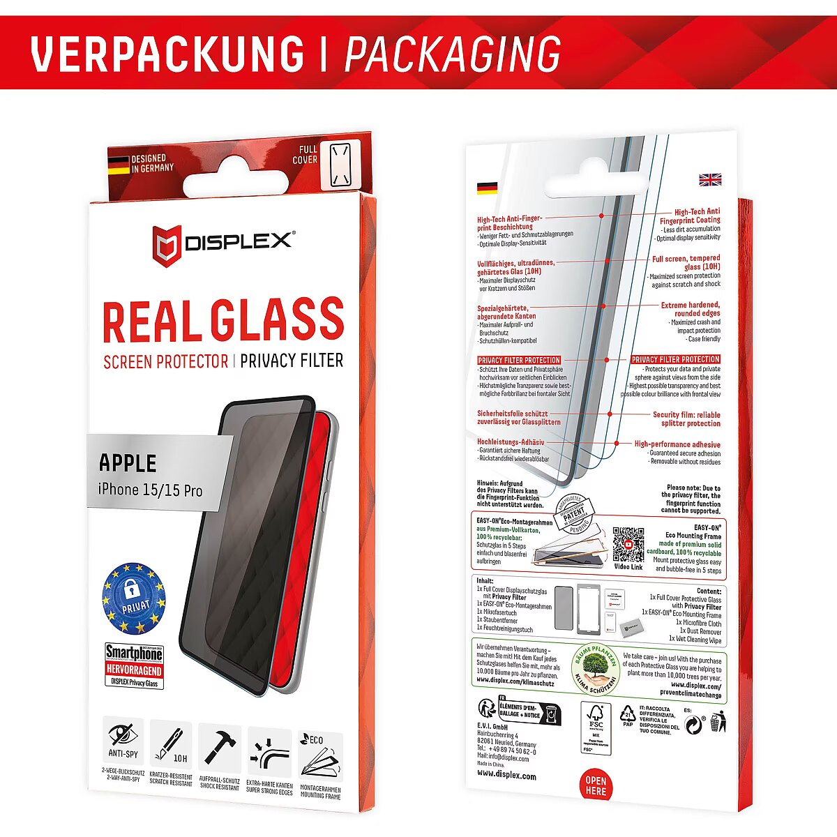 LongProductName - DISPLEX Privacy Full Cover Screen Protector (10H) for Apple iPhone 15/15 Pro, Eco Mounting Frame, Privacy Filter, Tempered Glass, scratch resistant protective film, case friendly