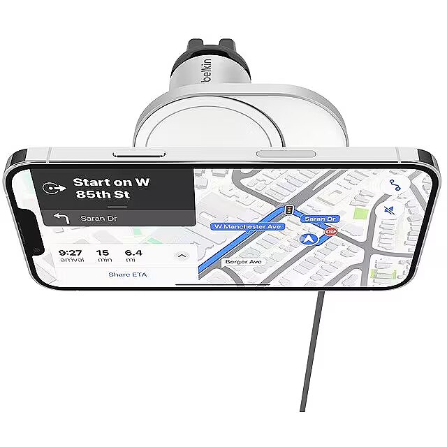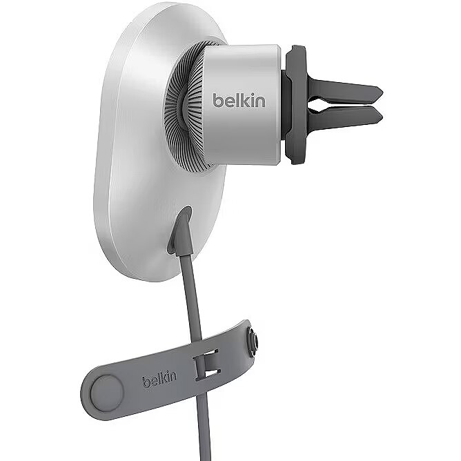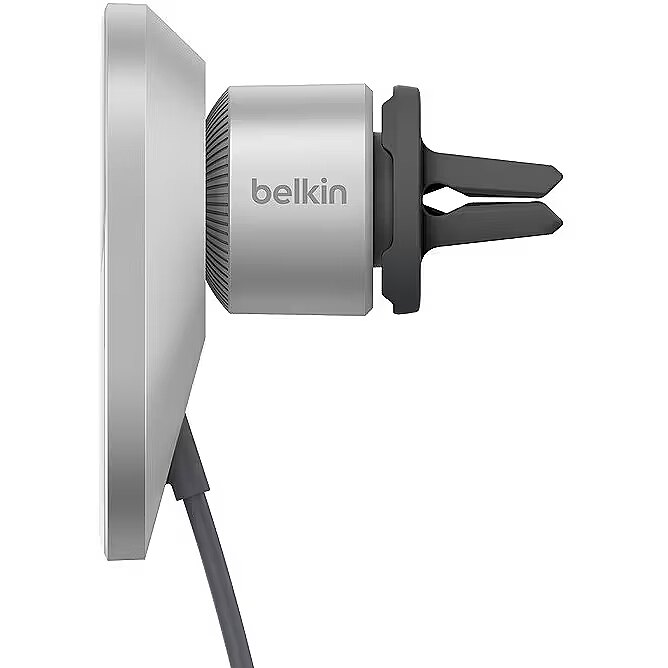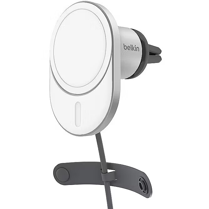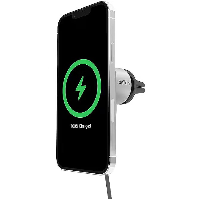 This wireless car charger provides up to 2x faster wireless charging with Qi2 to quickly, easily and safely charge a Qi2-compatible iPhone (12 series and newer) up to 15W. The grille mount remains stable while driving, with a convenient, smooth one-handed adjustment for vertical and horizontal positioning. Car phone charger provides up to 2x faster wireless charging with Qi2 technology and up to 15 watts of power Seamless positioning and driving ensures your iPhone is securely attached Strong magnetic connection with high-quality grille mount ensures one-handed positioning with perfect alignment View in portrait or landscape orientation for optimised access to charging, calls and navigation Convenient cable strap and rear cable holder keep the cable within reach and prevent tangling Qi2 charger designed to work with MagSafe-compatible cases  Sleek design with a slim profile that complements your iPhone