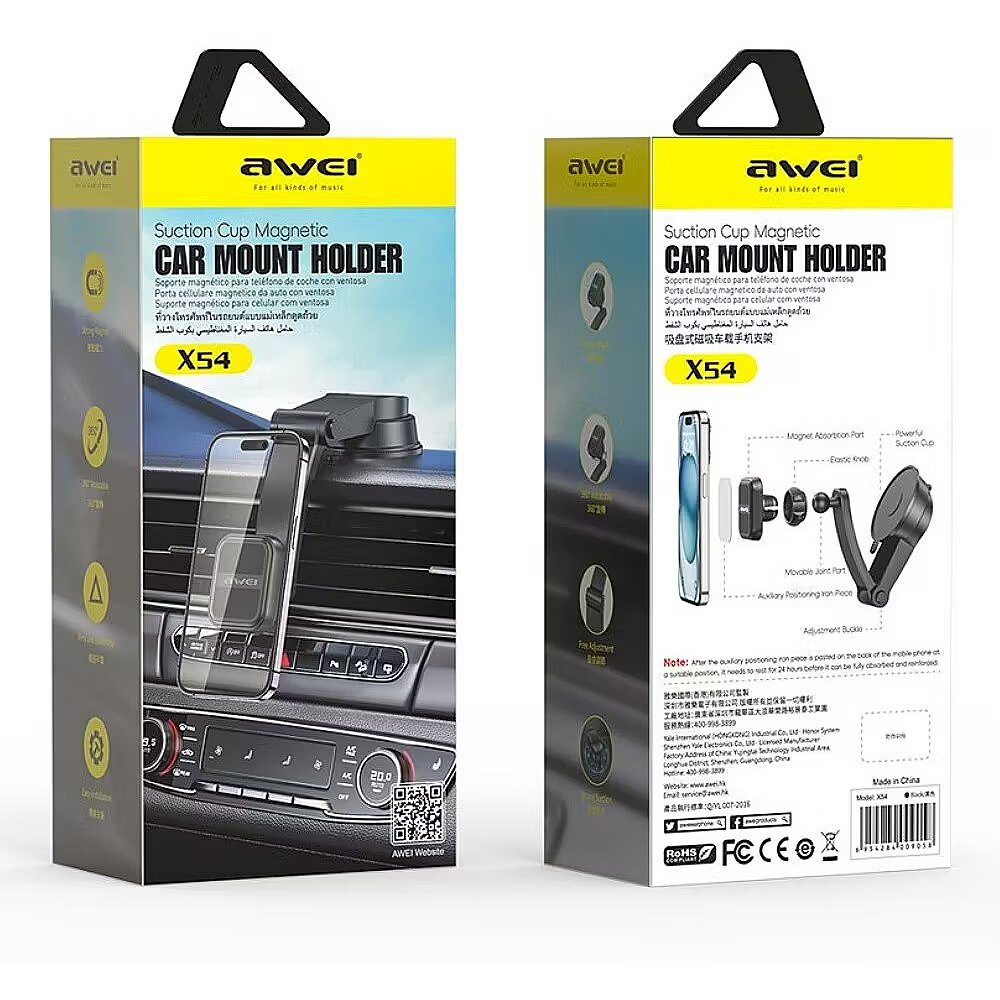 Description - AWEI X54 is a functional and stylish car mount, designed for safe and convenient use of your phone while driving. This magnetic mount allows for easy attachment and detachment of your device, while providing stability even on uneven roads. Key product features: Magnetic mounting system: Thanks to strong magnets, the phone is securely held in the mount, eliminating the risk of it falling out. Universality: The mount fits most smartphone models, regardless of their size. Adjustment: The ability to adjust the tilt angle allows you to optimally adjust the position of the phone to the driver's individual preferences. Easy installation: The mount can be easily attached to the windshield or dashboard using the included accessories. Solid construction: Made of high-quality materials, ensuring durability and resistance to damage. Compact size: It does not take up much space in the car. Aesthetic appearance: The elegant design makes the mount look great in any car interior. Application: Navigation: Thanks to the mount, you can conveniently use GPS navigation while driving. Phone calls: Safe hands-free phone calls. Music playback: Listen to your favorite music while traveling. Summary: AWEI X54 is a practical and reliable solution for all drivers who value comfort and safety while driving. Thanks to this mount, you will always have your phone at hand, and at the same time you will be able to focus on the road.