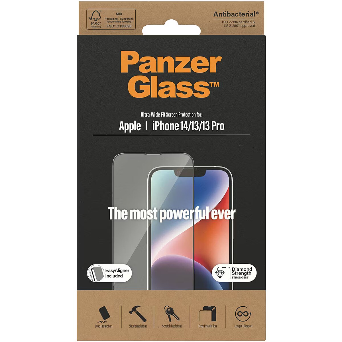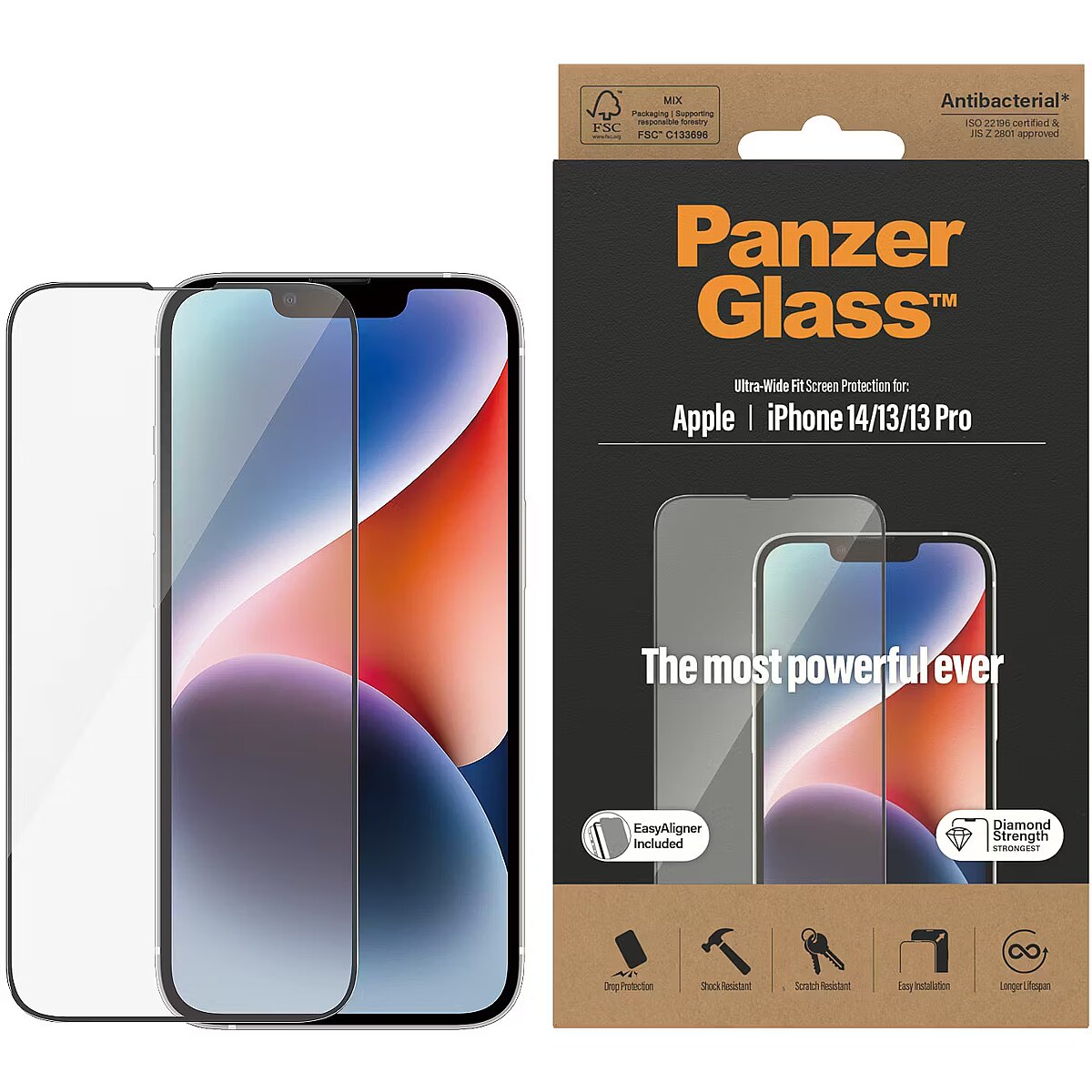 LongSummaryDescription - PanzerGlass ® Screen Protector iPhone 14 | 13 | 13 Pro | Ultra-Wide Fit w. EasyAligner. Brand compatibility: Apple, Compatibility: Apple - iPhone 14, Apple - iPhone 13, Apple - iPhone 13 Pro. Dry application. Protection features: Scratch resistant, Shock resistant, Anti-bacterial. Material: Tempered glass, Polyethylene terephthalate (PET), Silicone, Product colour: Transparent. Quantity per pack: 1 pc(s)