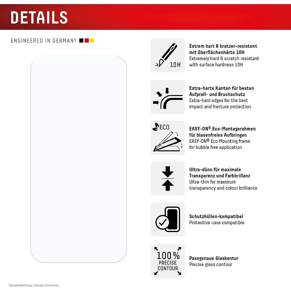 LongDesc - Real Glass (2D) with Case, 360°-Protection with EASY-ON® Eco Mounting Frame Protective case for 360°-protectionOur Displex protective glass is manufactured to within 5/100 mm of the smartphone contours and therefore fits perfectly on your smartphone. In addition, the protective film is ultra-thin at 3mm. This means that the transparent case, that is included in this product, can be used perfectly with the screen protection glass. But also all other standard-sized protective cases can be used with the screen protector. Thus, your smartphone is optimally protected all around by a combined protection of the Displex Tempered Glass and your favourite case. Tempered glass with rounded edgesAll Displex protective glasses have a surface hardness of 10H and are therefore not only more scratch-, break- and shock-resistant than comparable brand products, but even surpass sapphire glass, which is used in luxury watches and has a hardness of 9H.Even the edges, the area of the smartphone and protective glass most susceptible to breakage and impact, are specially hardened, rounded by 4-fold polishing and finished with a shock-absorbing edge. This elaborate production process further increases the protection against knocks and bumps and allows a particularly pleasant use of the smartphone. With these features, the protective glass is extremely resistant and guarantees maximum breakage resistance. Case-friendlyOur Displex protective glass is manufactured to within 5/100 mm of the smartphone contours and therefore fits perfectly on your smartphone. In addition, the protective film is ultra-thin at 0,3mm. This means that all standard-sized protective cases can be used with the screen protection glass. Thus, your smartphone is optimally protected all around by a combined protection of the Displex Tempered Glass and your favourite case. Anti fingerprint coatingThe top layer of our 4-Layer Technology is a high-tech plasma coating. With an extremely long-lasting effect, this coating effectively repels fingerprints. In addition, the plasma coating guarantees a soft scrolling experience. This technology not only makes your display look better, but it also keeps it cleaner and therefore requires less frequent cleaning. High-tech splinter protectionThe high-tech shatter protection integrated in the Real Glass from Displex guarantees absolute safety even if the protective glass breaks. Thanks to the composite material of the second layer in the protective glass, it does not shatter and thus guarantees absolutely safe use. If the worst should come to the worst and the protective glass has absorbed a blow, fall or impact and is broken, the Displex protective glass can be easily pulled off the display in one piece thanks to the integrated high-tech shatter protection. High-performance adhesiveOnce the protective glass has been fitted, the high-performance adhesive ensures optimum adhesion properties and a clear look. The adhesive is adapted to all display coatings of the various manufacturers so that the protective film for mobile phones holds reliably in the long term. The visual appearance is not affected either: despite the screen protection film, you can enjoy gripping videos and photos with maximum transparency and colour fidelity. Simple & bubble-free applicationWith the EASY-ON® Eco Mounting Frame and the accompanying video tutorials, mounting the tempered glass is incredibly quick, easy and precise. In addition the EASY-ON® Eco Mounting Frame is made of premium solid cardboard and is therefore not only sustainable, but also a 100% recyclable. The result is worth seeing: no crooked positioning of the screen protector on the display, no concealed openings for speakers or microphones and certainly no bubbles under the protective glass.