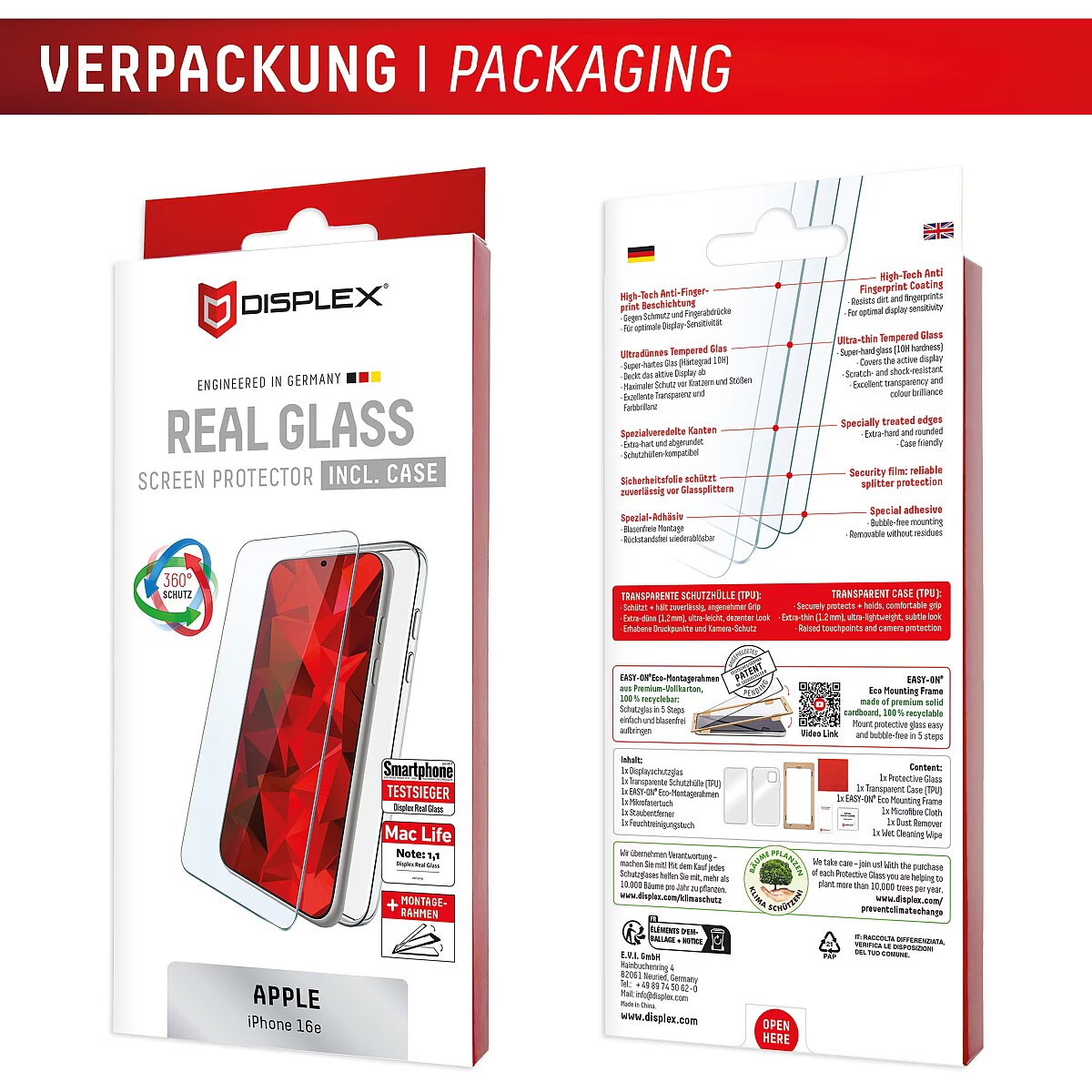 LongSummaryDescription - Displex Screen Protector + Case for Apple iPhone 16e, Eco Mounting Frame, scratch resistant. Brand compatibility: Apple, Compatibility: iPhone 16e. Dry application. Protection features: Impact resistant, Scratch resistant, Dust resistant. Surface finish: Glossy, Material: Tempered glass, Product colour: Transparent. Quantity per pack: 1 pc(s)