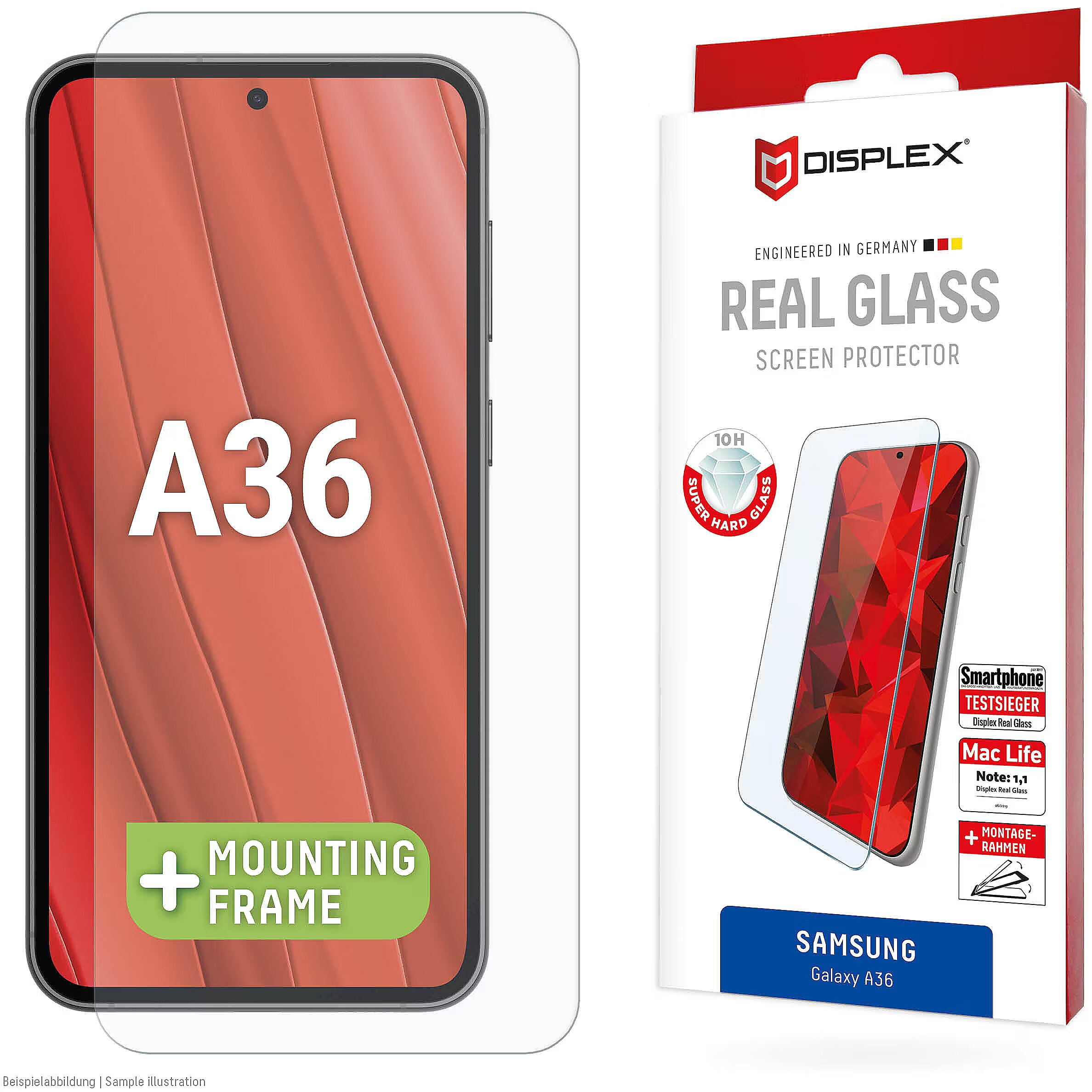 LongSummaryDescription - Displex Screen Protector (10H) for Samsung Galaxy A36, Eco Mounting Frame, scratch resistant. Brand compatibility: Samsung, Compatibility: Galaxy A36. Dry application. Protection features: Dirt resistant, Impact resistant, Scratch resistant. Material: Tempered glass, Product colour: Transparent. Quantity per pack: 1 pc(s)