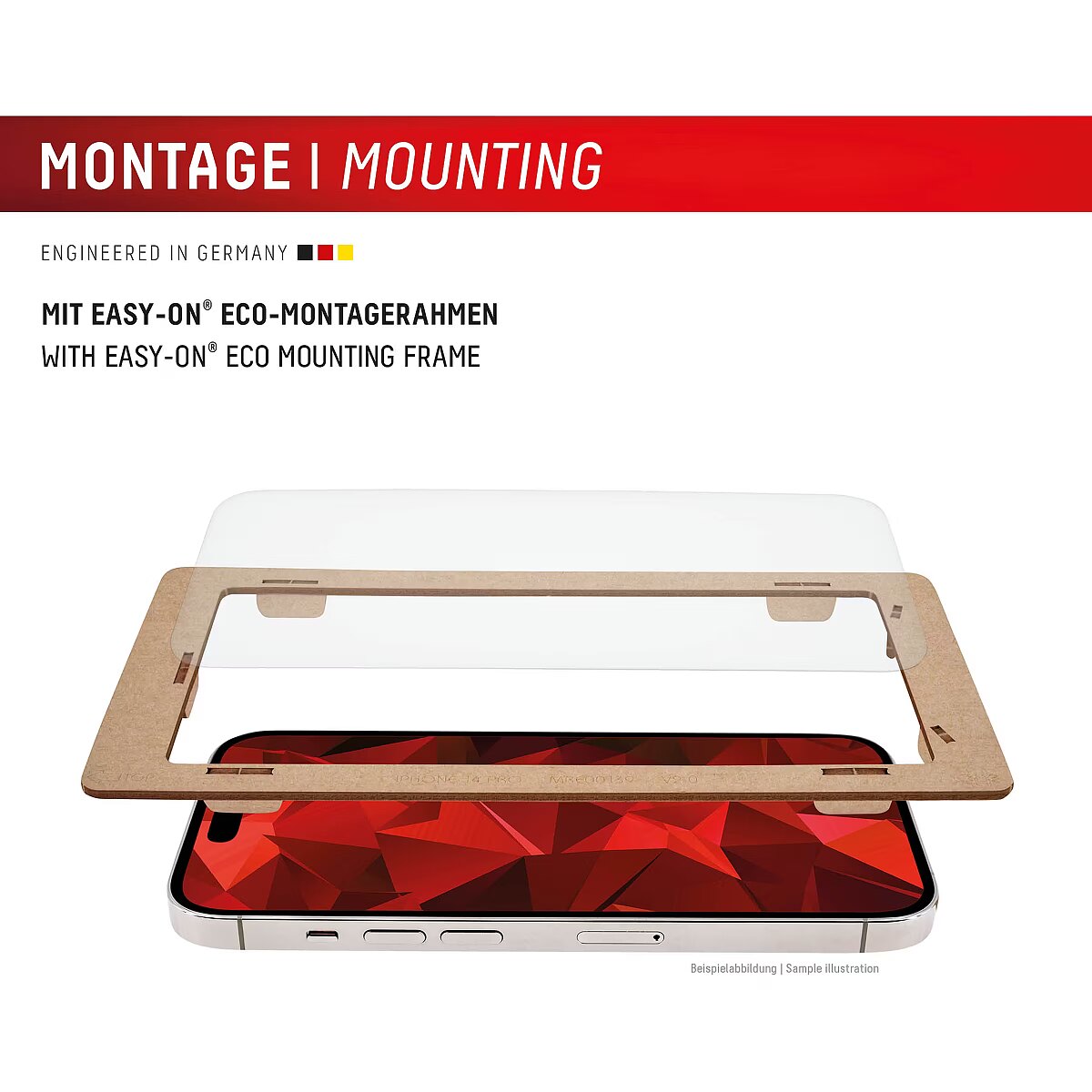 LongDesc - Real Glass (2D) with EASY-ON® Eco Mounting Frame Tempered glass with rounded edgesAll Displex protective glasses have a surface hardness of 10H and are therefore not only more scratch-, break- and shock-resistant than comparable brand products, but even surpass sapphire glass, which is used in luxury watches and has a hardness of 9H.Even the edges, the area of the smartphone and protective glass most susceptible to breakage and impact, are specially hardened, rounded by 4-fold polishing and finished with a shock-absorbing edge. This elaborate production process further increases the protection against knocks and bumps and allows a particularly pleasant use of the smartphone. With these features, the protective glass is extremely resistant and guarantees maximum breakage resistance. Case-friendlyOur Displex protective glass is manufactured to within 5/100 mm of the smartphone contours and therefore fits perfectly on your smartphone. In addition, the protective film is ultra-thin at 0,3mm. This means that all standard-sized protective cases can be used with the screen protection glass. Thus, your smartphone is optimally protected all around by a combined protection of the Displex Tempered Glass and your favourite case. Anti fingerprint coatingThe top layer of our 4-Layer Technology is a high-tech plasma coating. With an extremely long-lasting effect, this coating effectively repels fingerprints. In addition, the plasma coating guarantees a soft scrolling experience. This technology not only makes your display look better, but it also keeps it cleaner and therefore requires less frequent cleaning. High-tech splinter protectionThe high-tech shatter protection integrated in the Real Glass from Displex guarantees absolute safety even if the protective glass breaks. Thanks to the composite material of the second layer in the protective glass, it does not shatter and thus guarantees absolutely safe use. If the worst should come to the worst and the protective glass has absorbed a blow, fall or impact and is broken, the Displex protective glass can be easily pulled off the display in one piece thanks to the integrated high-tech shatter protection. High-performance adhesiveOnce the protective glass has been fitted, the high-performance adhesive ensures optimum adhesion properties and a clear look. The adhesive is adapted to all display coatings of the various manufacturers so that the protective film for mobile phones holds reliably in the long term. The visual appearance is not affected either: despite the screen protection film, you can enjoy gripping videos and photos with maximum transparency and colour fidelity. Simple & bubble-free applicationWith the EASY-ON® Eco Mounting Frame and the accompanying video tutorials, mounting the tempered glass is incredibly quick, easy and precise. In addition the EASY-ON® Eco Mounting Frame is made of premium solid cardboard and is therefore not only sustainable, but also a 100% recyclable. The result is worth seeing: no crooked positioning of the screen protector on the display, no concealed openings for speakers or microphones and certainly no bubbles under the protective glass.